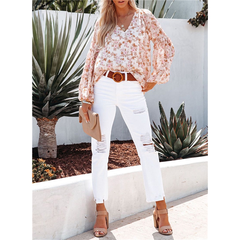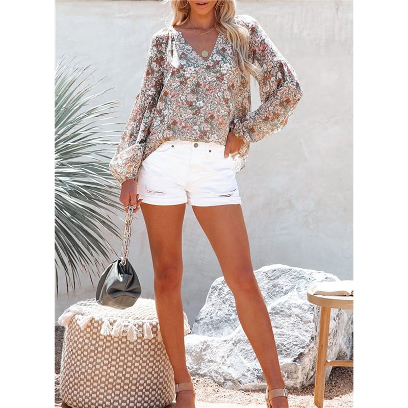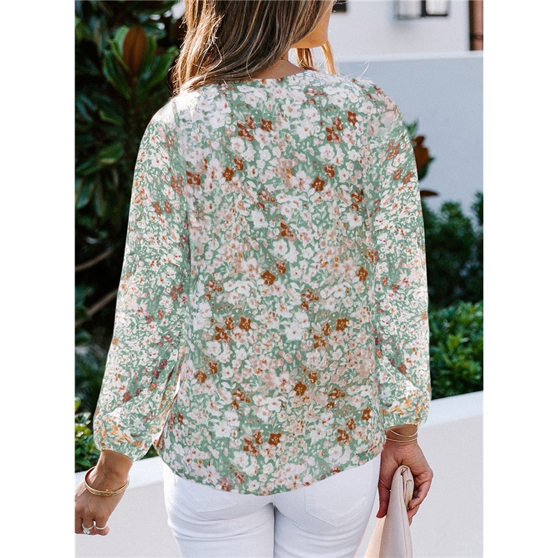 Women's V-Neck Chiffon Lantern Sleeve Floral Chiffon T-Shirt
