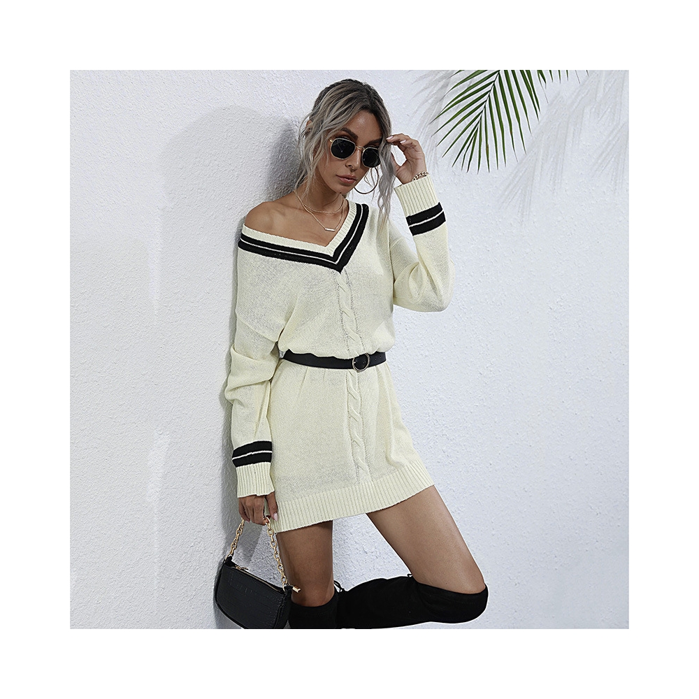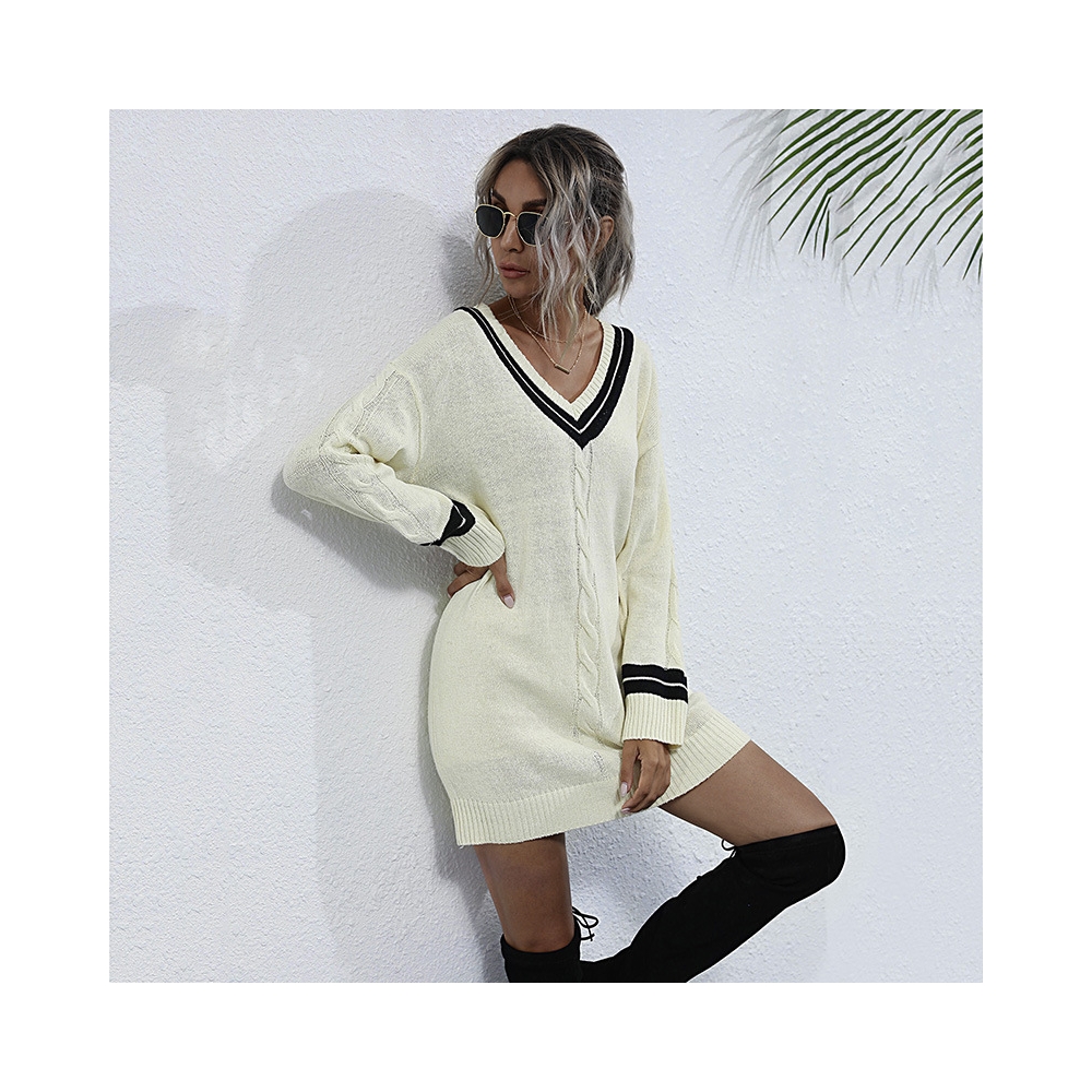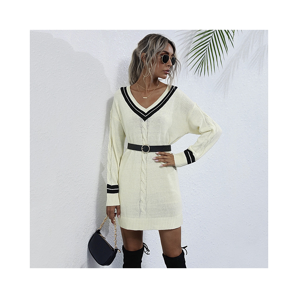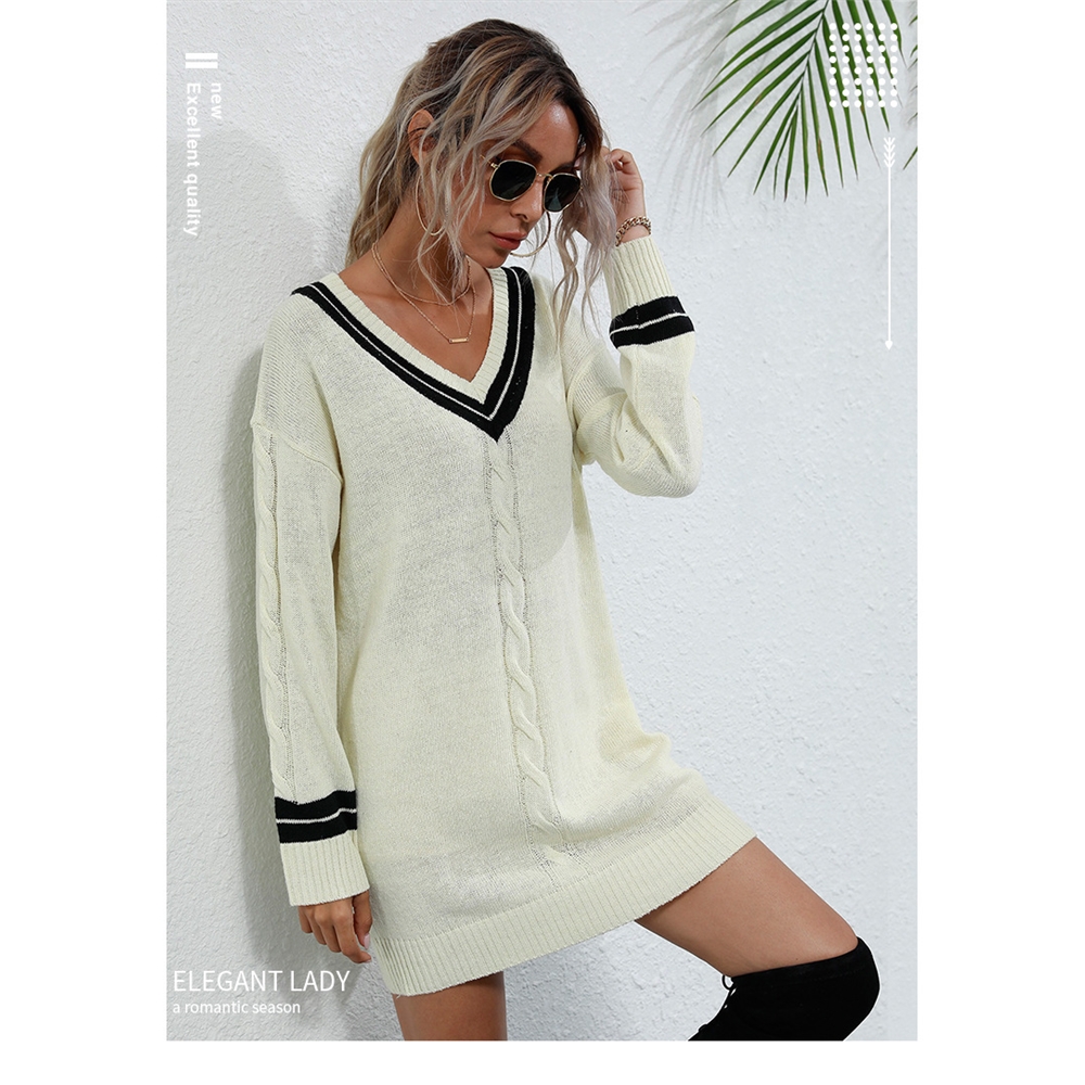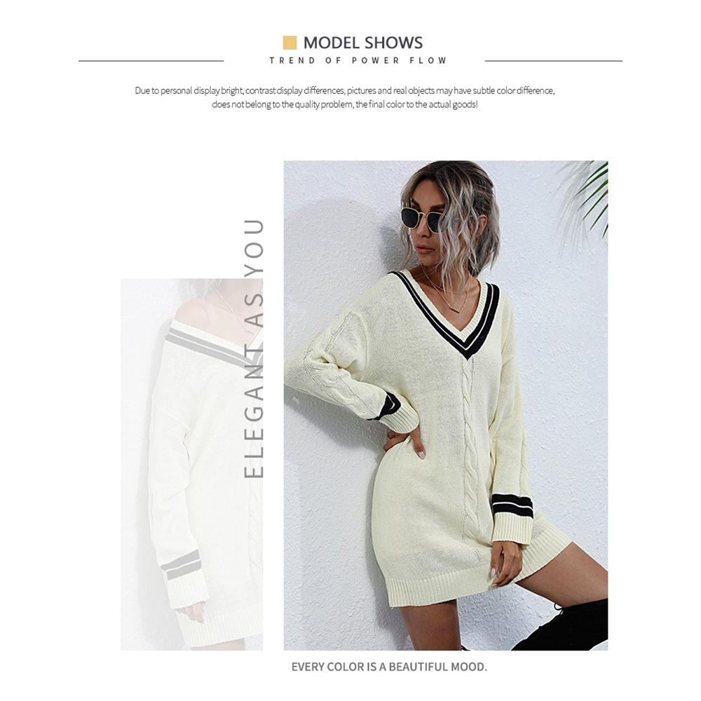 V-Neck Long Sleeves Twist Pullover Mini Sweater Dress