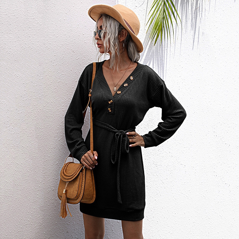 Long Sleeves Solid Color V-Neck Tied Knitted Sweater Dress