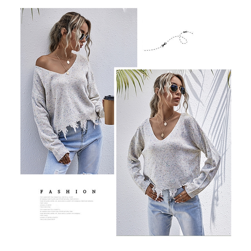 Casual Loose V-Neck Long Sleeves Fringed Short Knitted Sweater