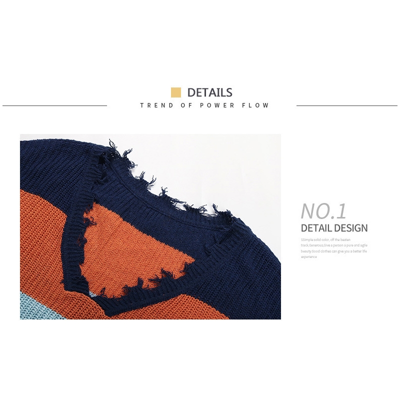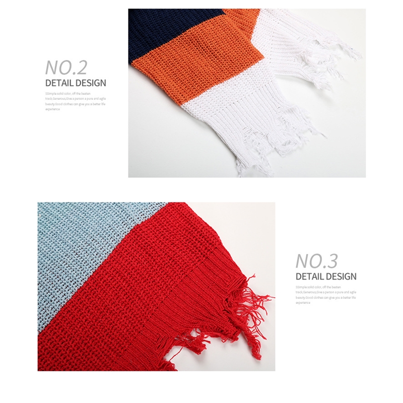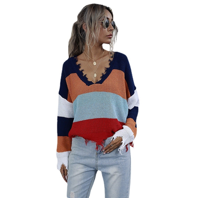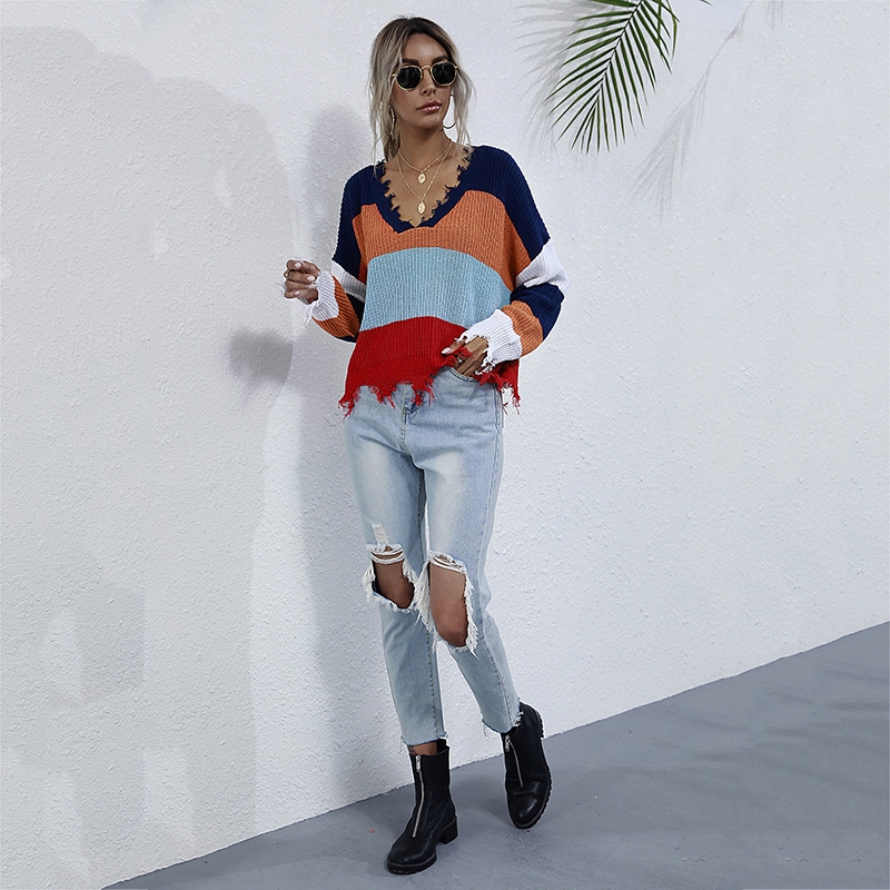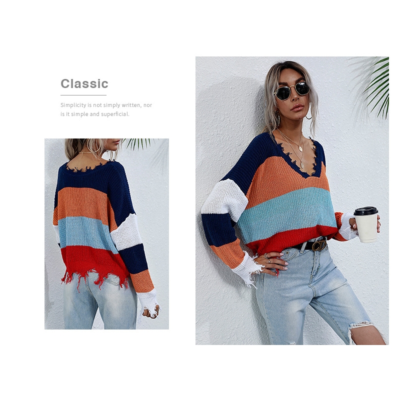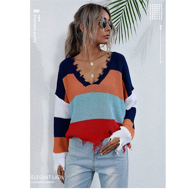 V-Neck Contrast Color Striped Ripped Brim Thin Sweater