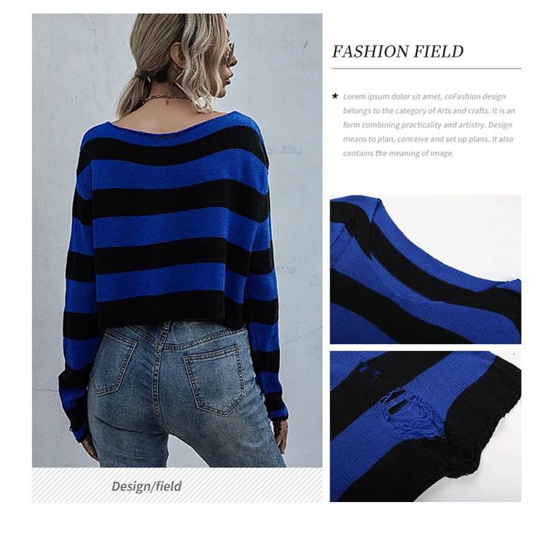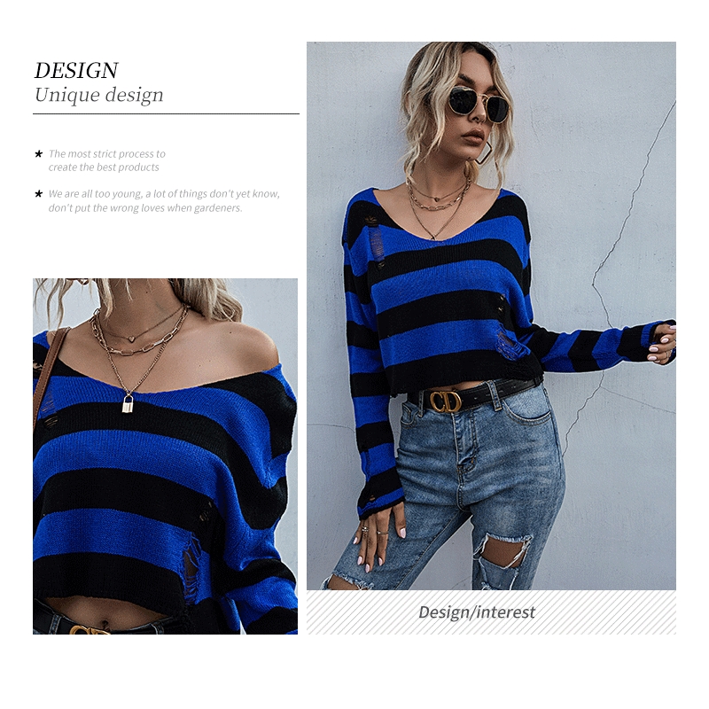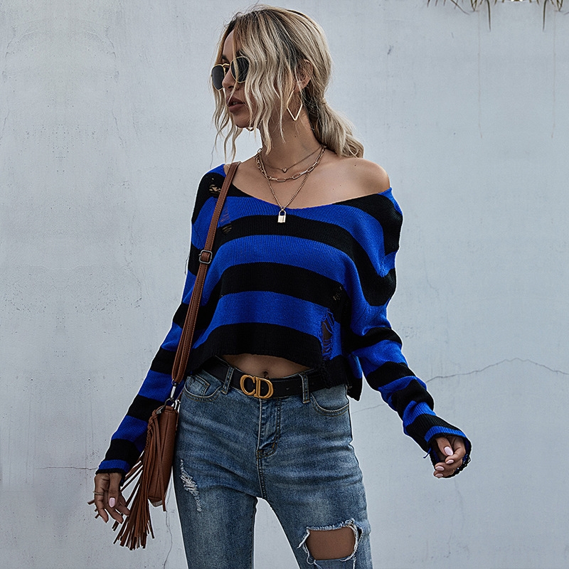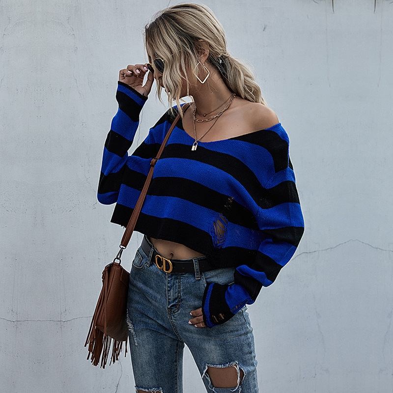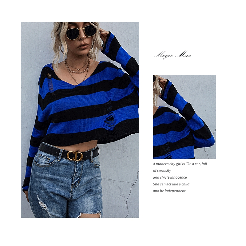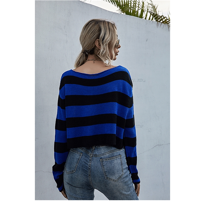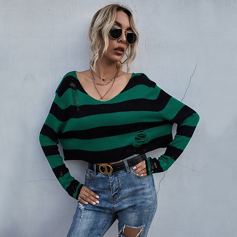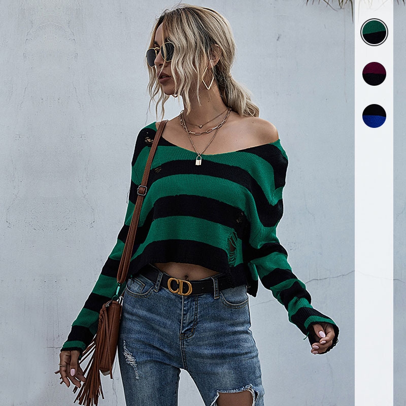 V-Neck Long Sleeves Striped Short Knitted Sweater