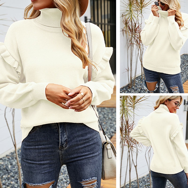 Long Sleeves Solid Color Ruffled High Neck Sweater