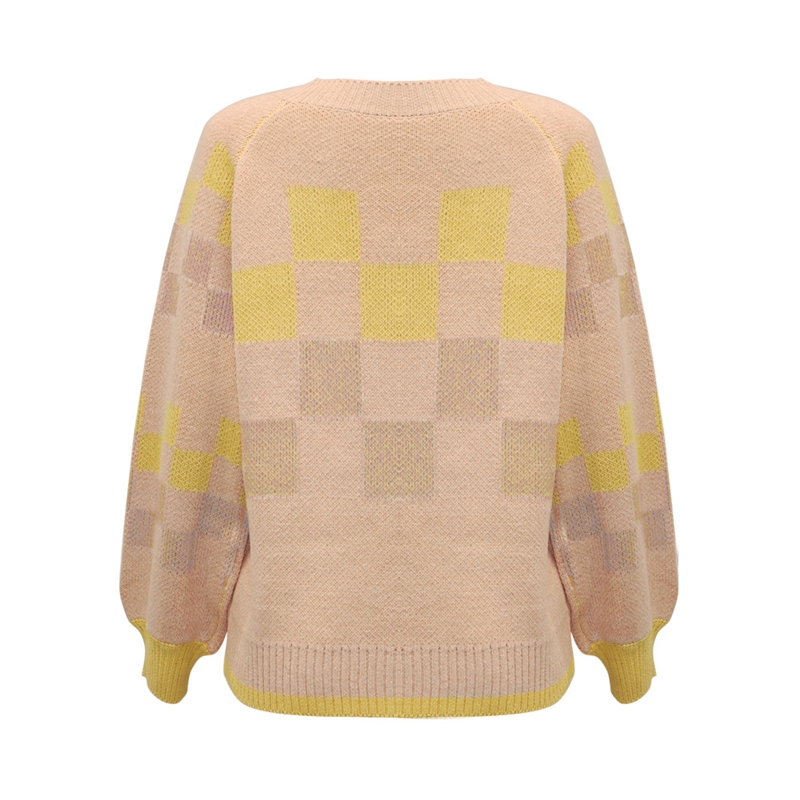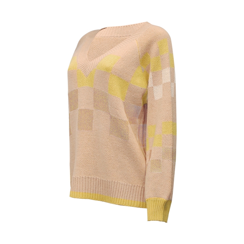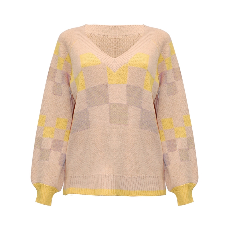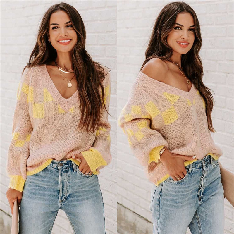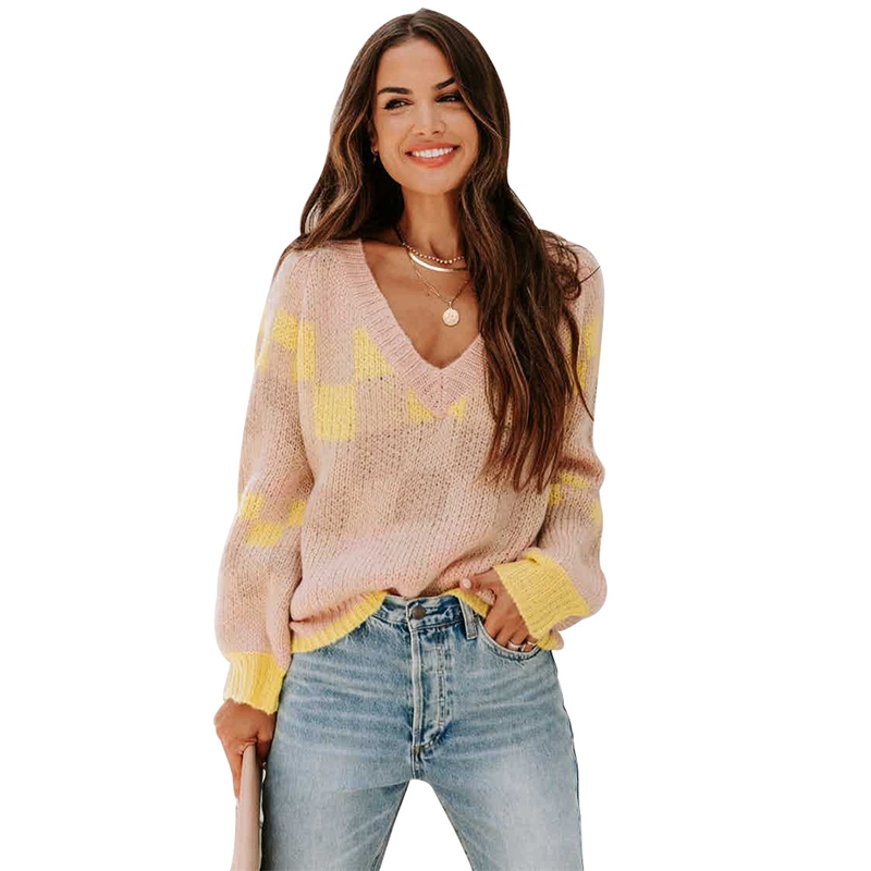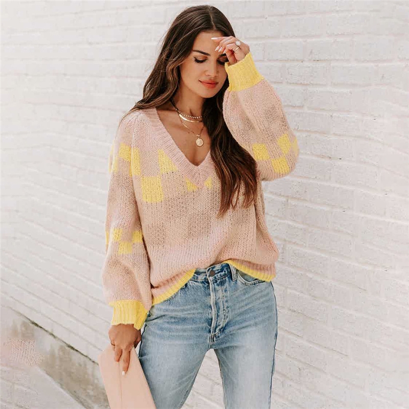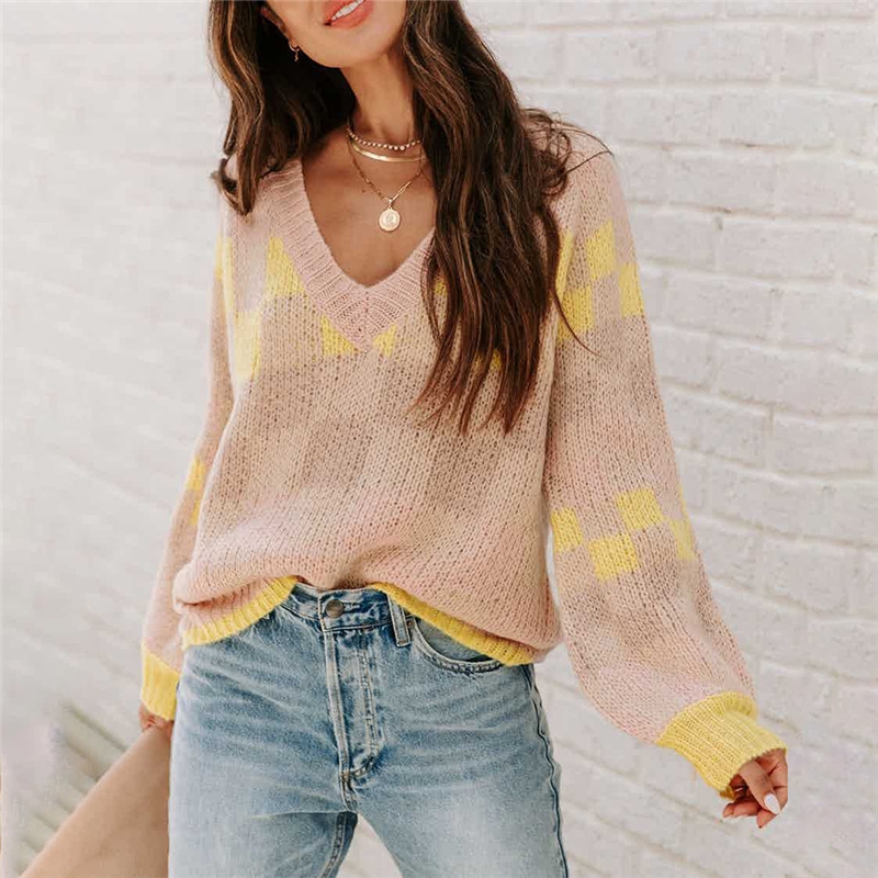 Contrast Color V-Neck Long Sleeves Casual Loose Sweater