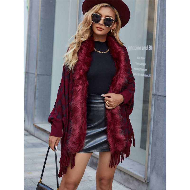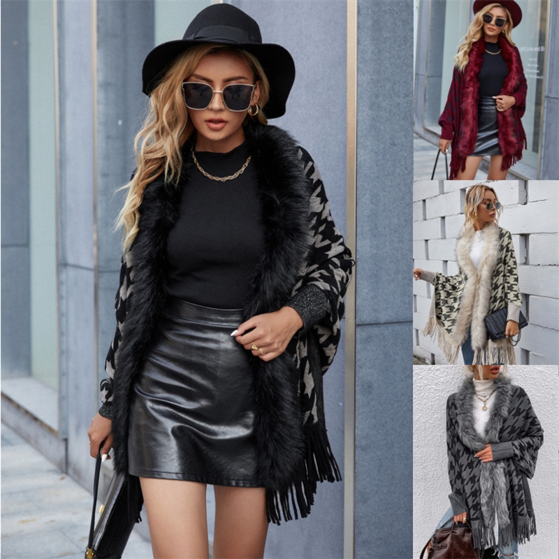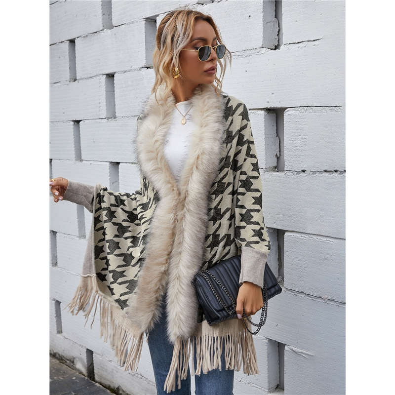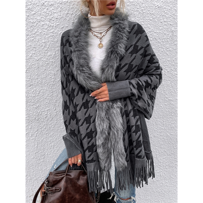 Light Luxury Feather Collar And Plaid Fringe Shawl Sweater