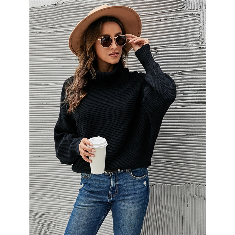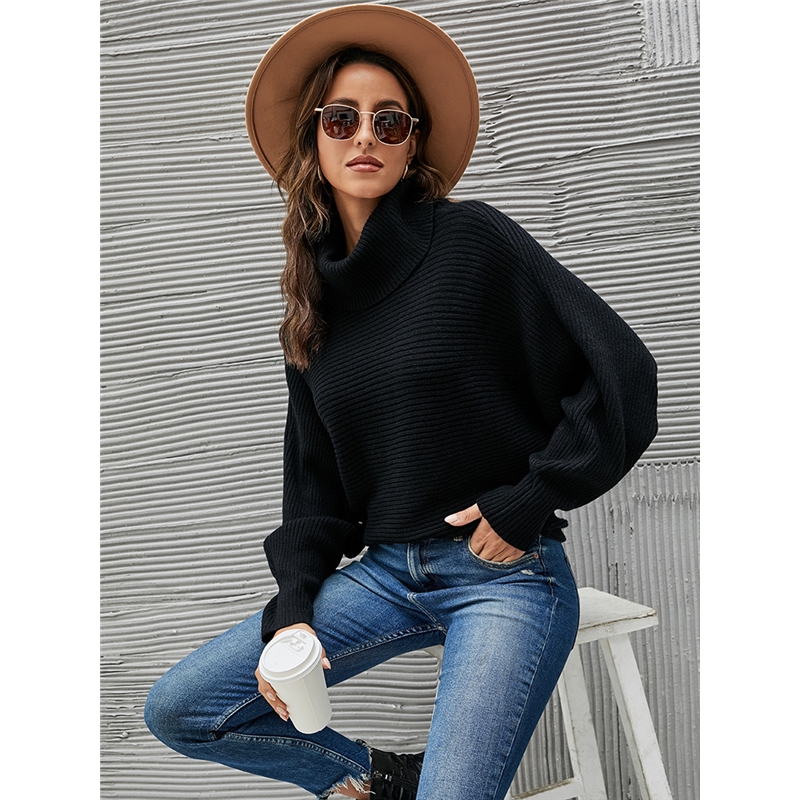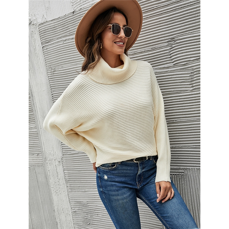 Batwing Sleeve High Neck Solid Color Sweater