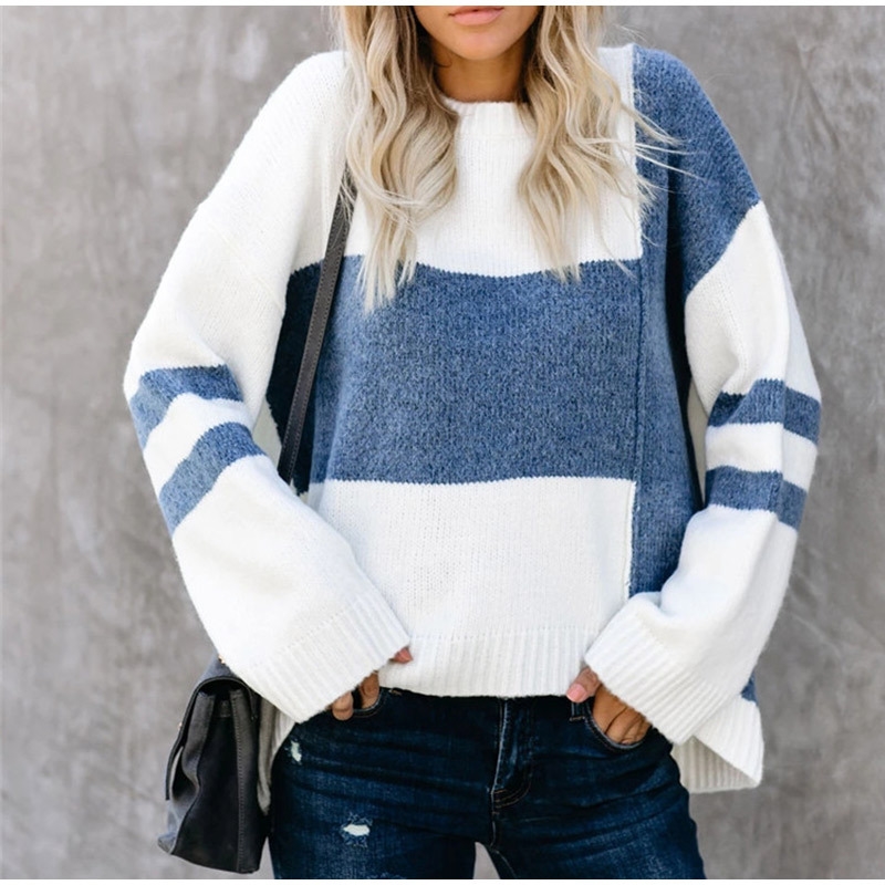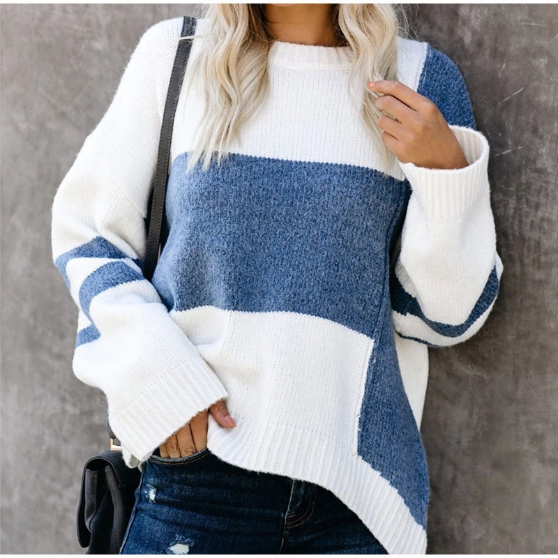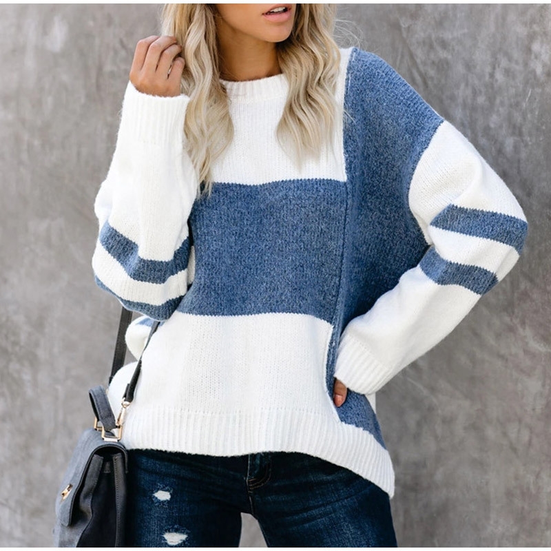Long Sleeve Round Neck Contrast Color Casual Sweater