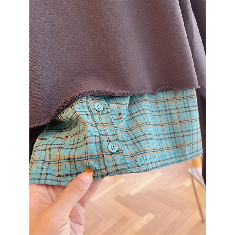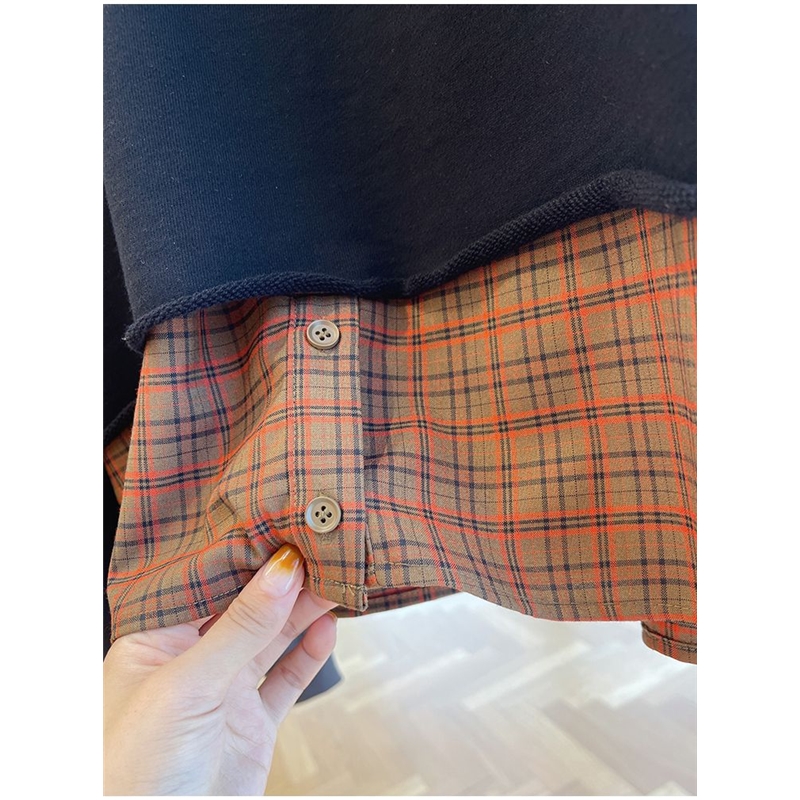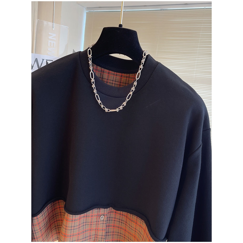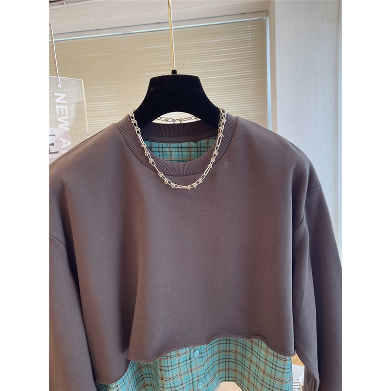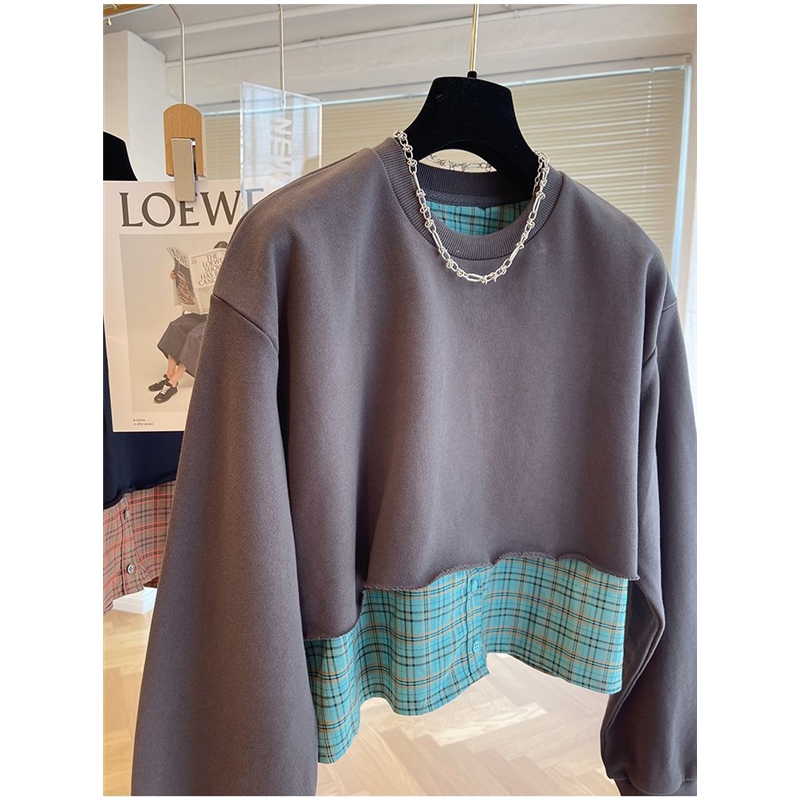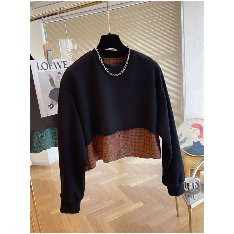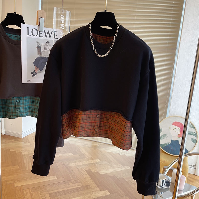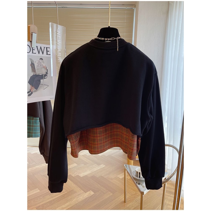 Long Sleeves Round Neck Plaid Paneled Short Sweatshirt