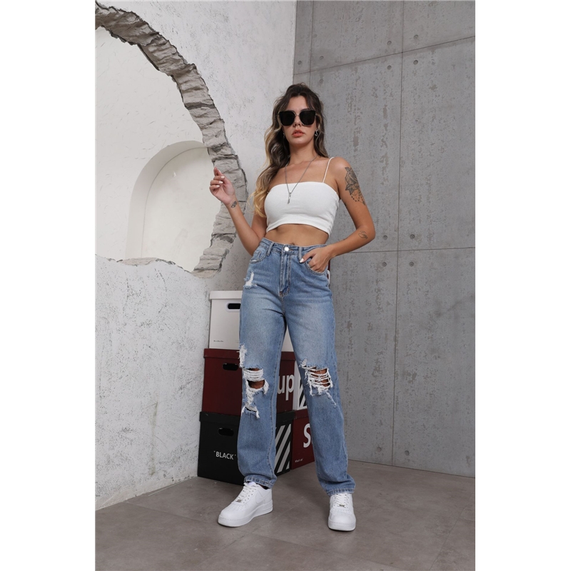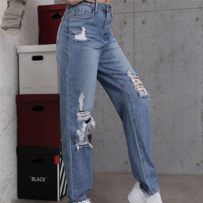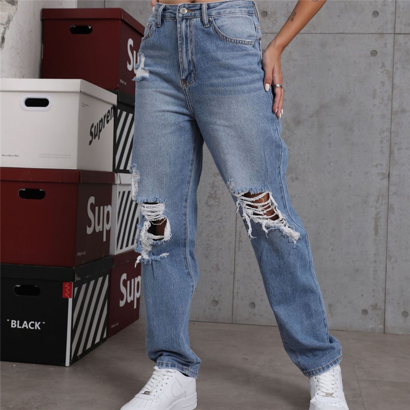 1. These Mid-Rise Street Straight Leg Hole Ripped Jeans are the perfect mix of high street fashion and street style.