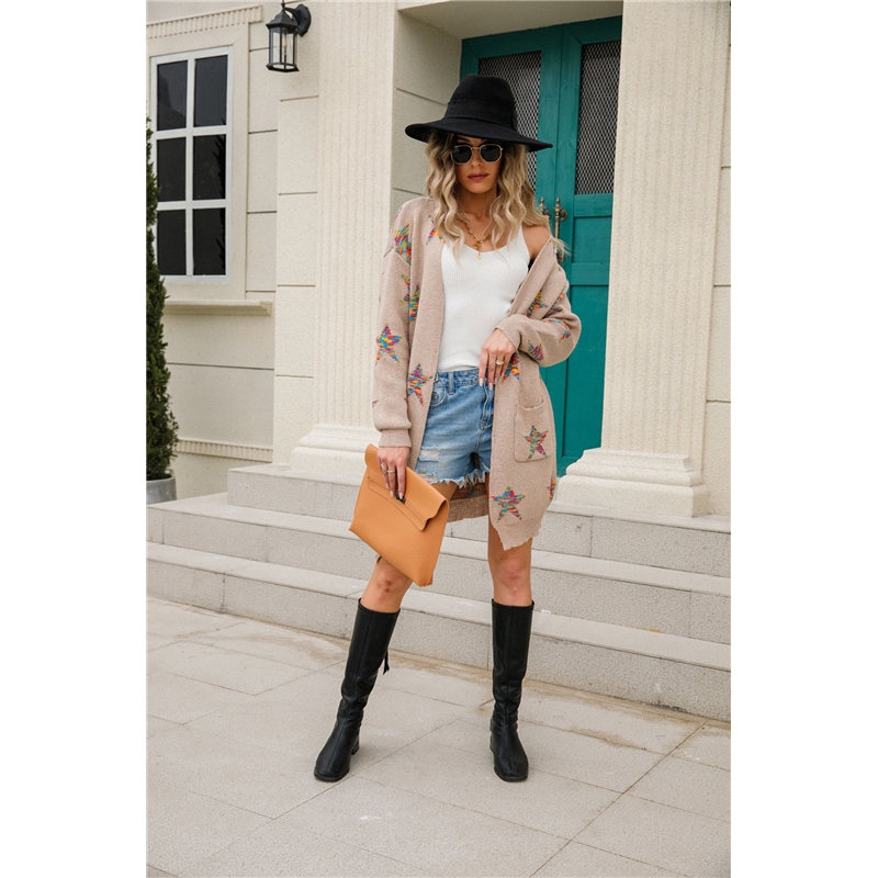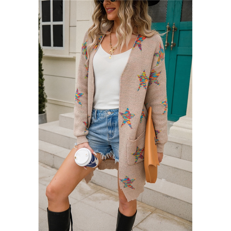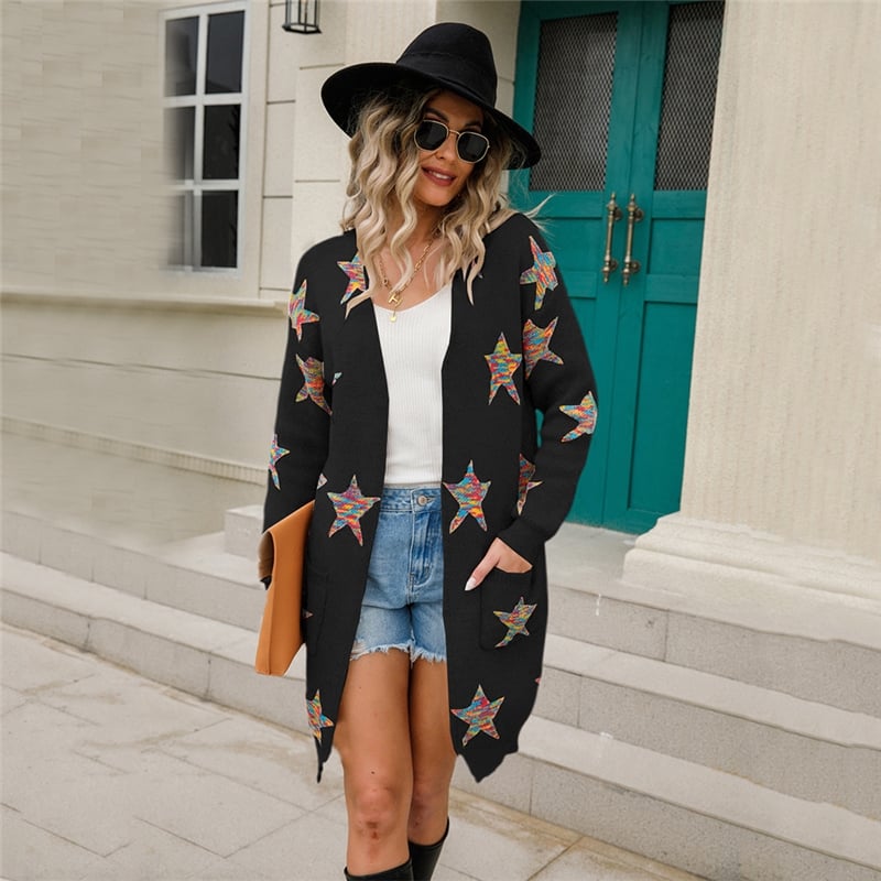 1. This long sleeve stars midi knitted cardigan is made of a lightweight, soft, and stretchable acrylic yarn blend.