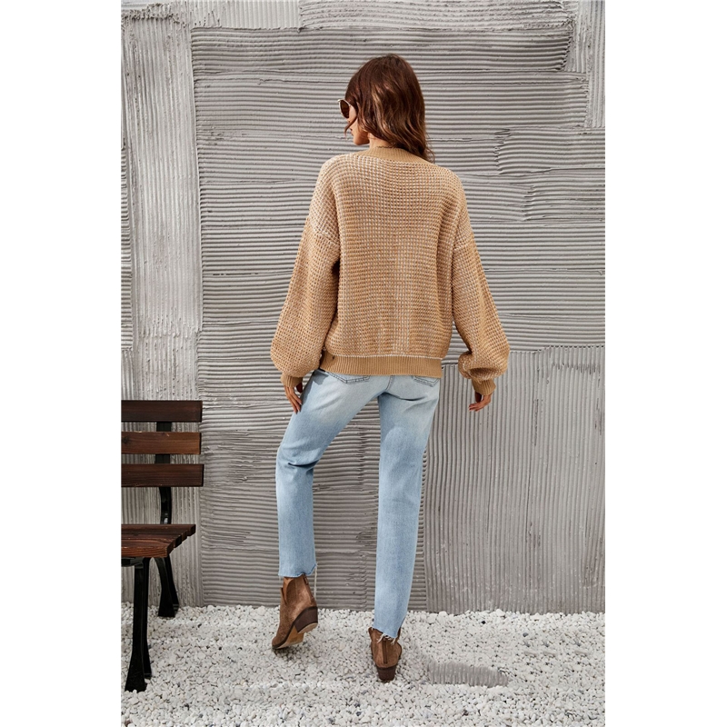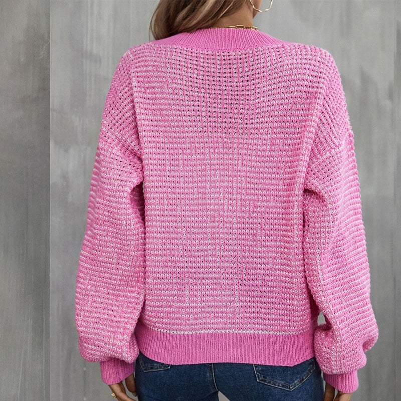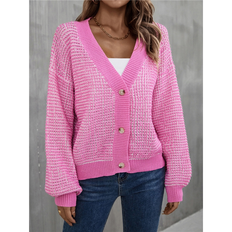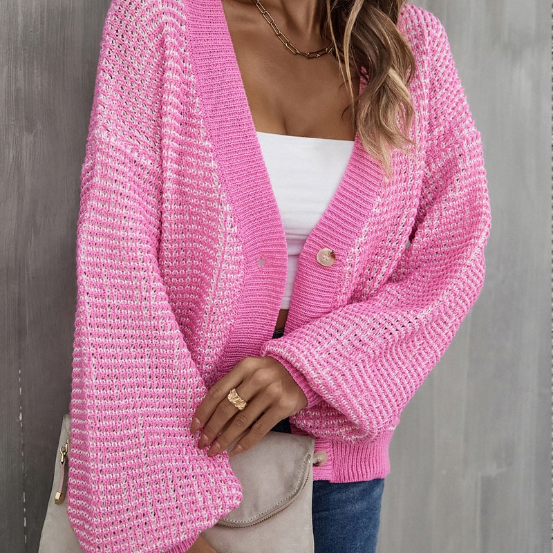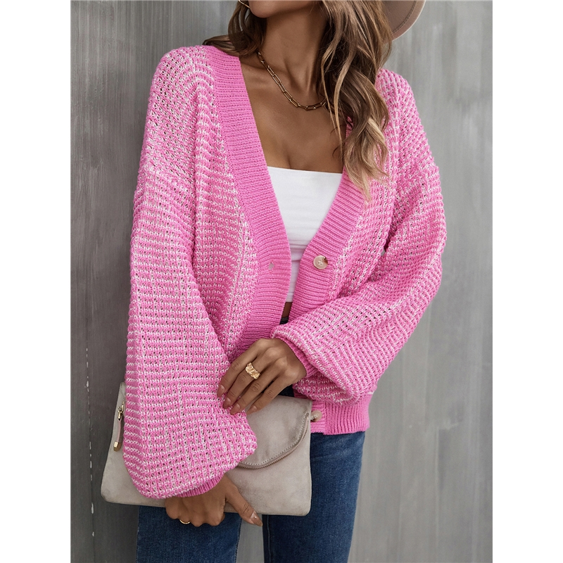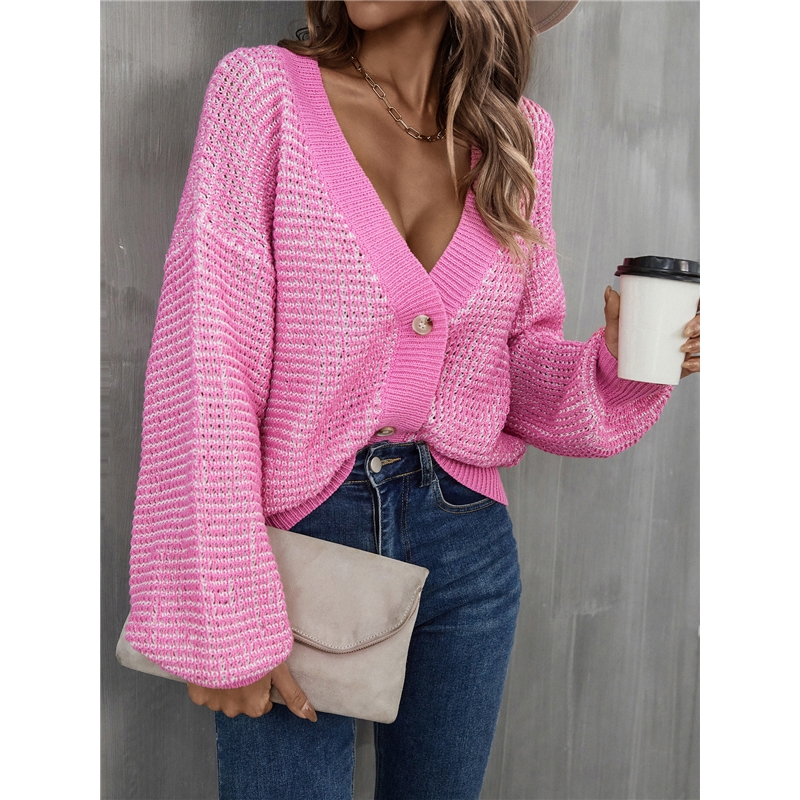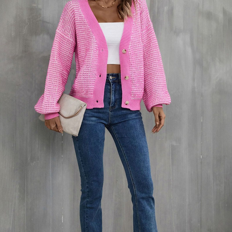 1. This long-sleeved short cardigan sweater features a bold contrast color, an eye-catching addition to any wardrobe.