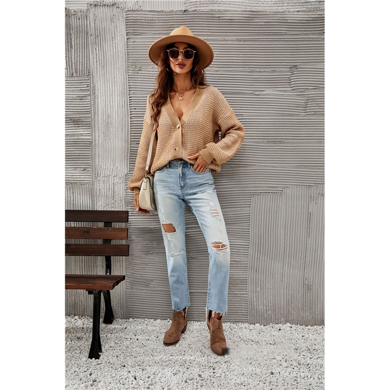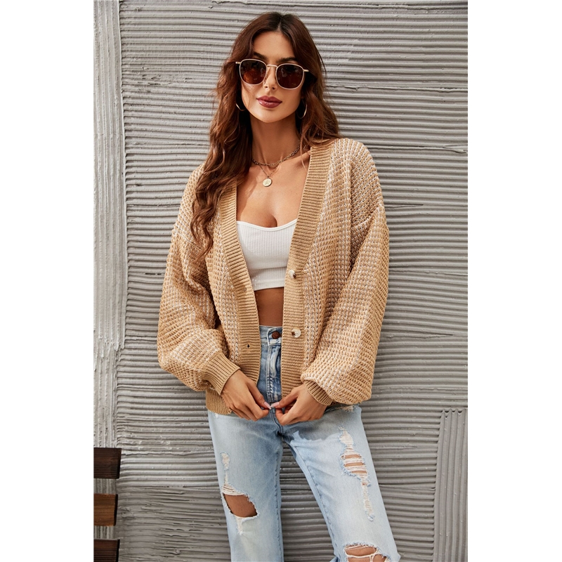 3. The cardigan is made from a soft and lightweight knit fabric for breathability and comfort.