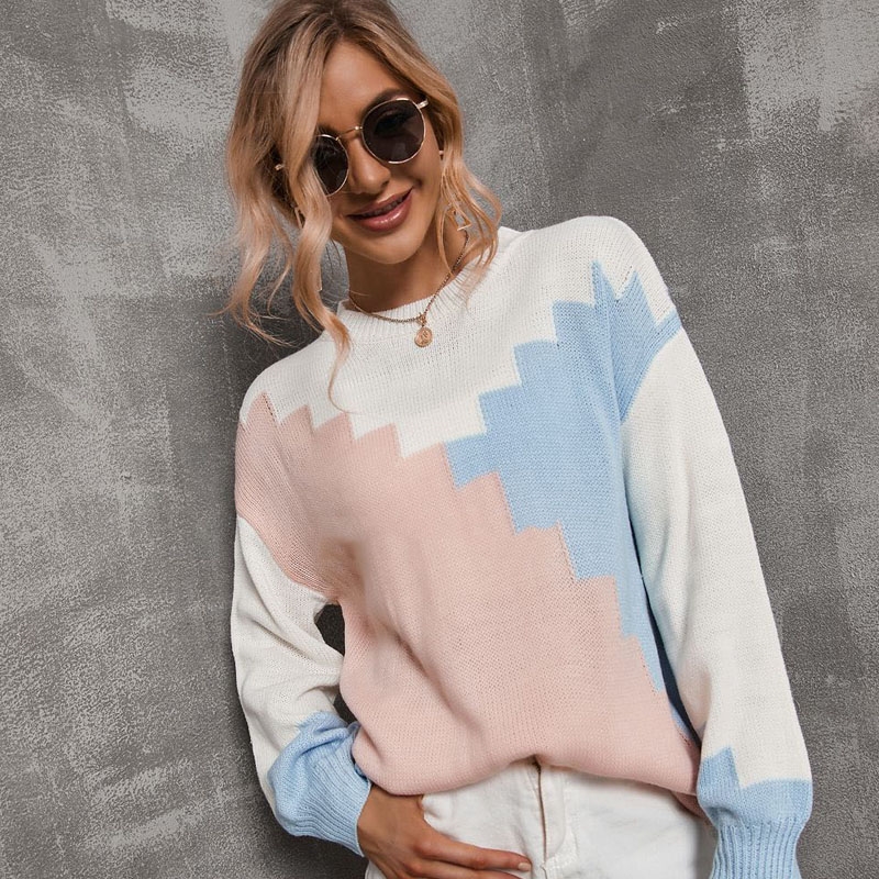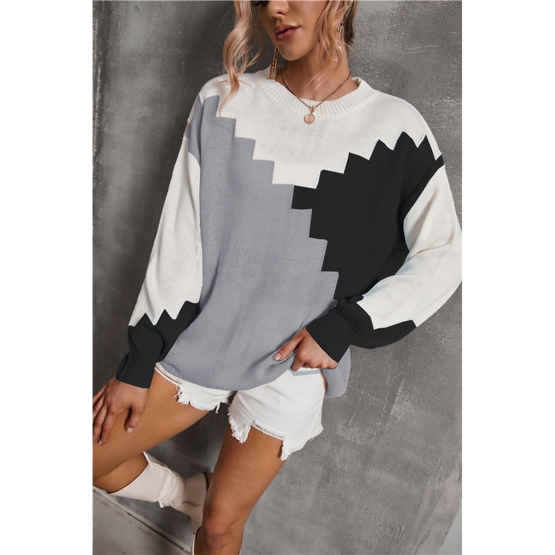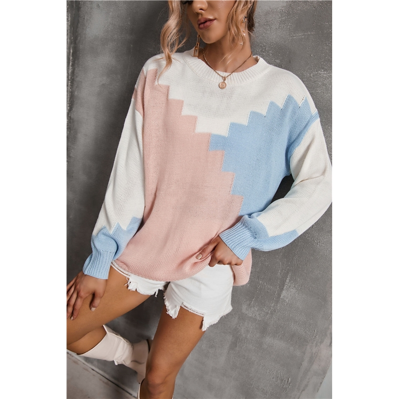 Long Sleeves Crewneck Contrast Color Pullover Sweater