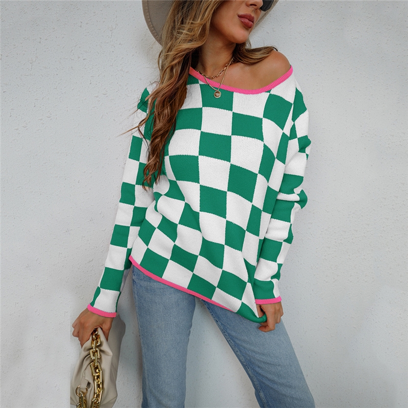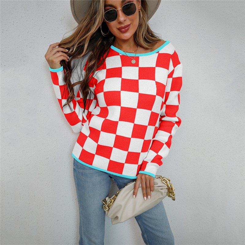 1. This crewneck plaid knitted sweater features fantastic contrast colors to draw the attention of your peers.