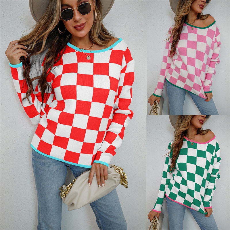 5. You will be sure to stay cozy and stylish with this eye-catching contrast color crewneck plaid knitted sweater.