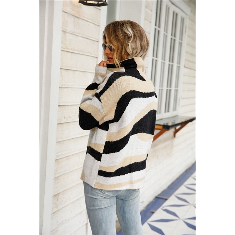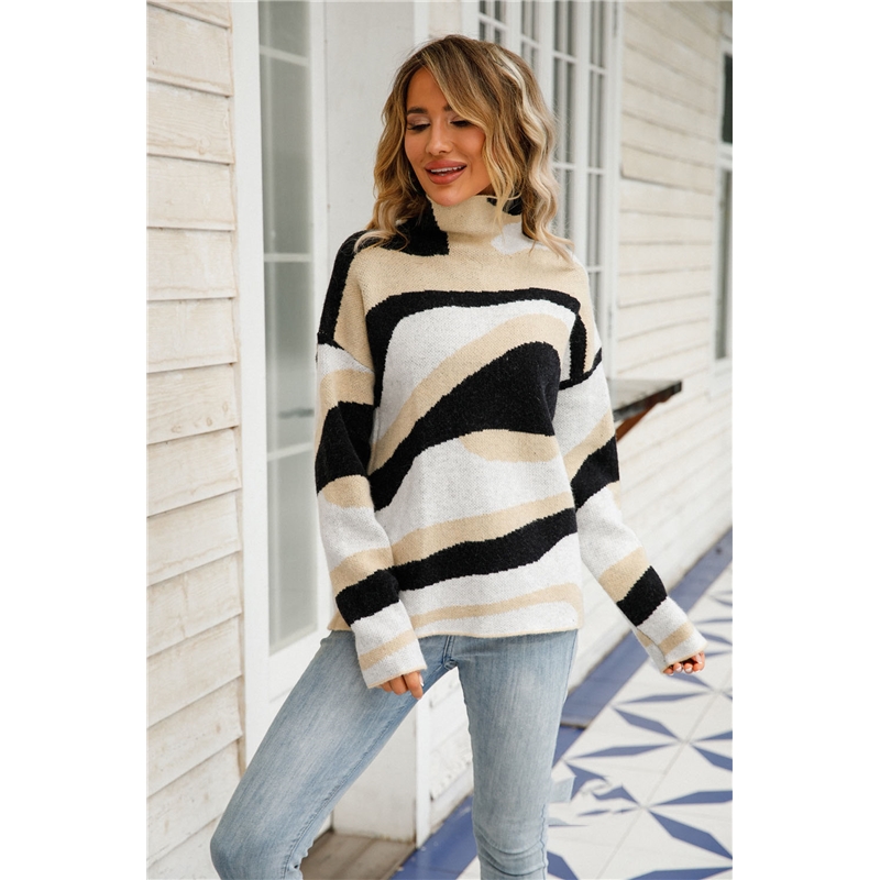 Casual Loose Contrast Color High Neck Knitted Sweater