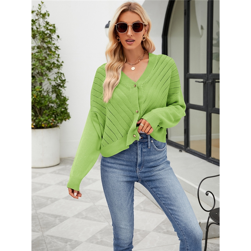 Solid Color Long Sleeves V-Neck Single Breasted Hollow Knitted Cardigan Sweater