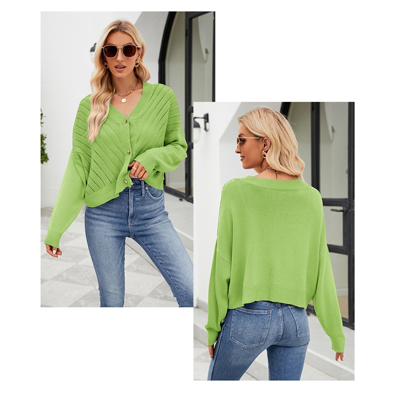 1. This solid colored cardigan sweater features a long sleeve with a V-neck and a single breasted front.