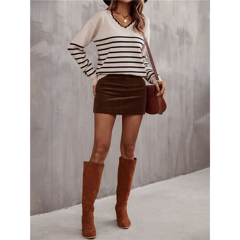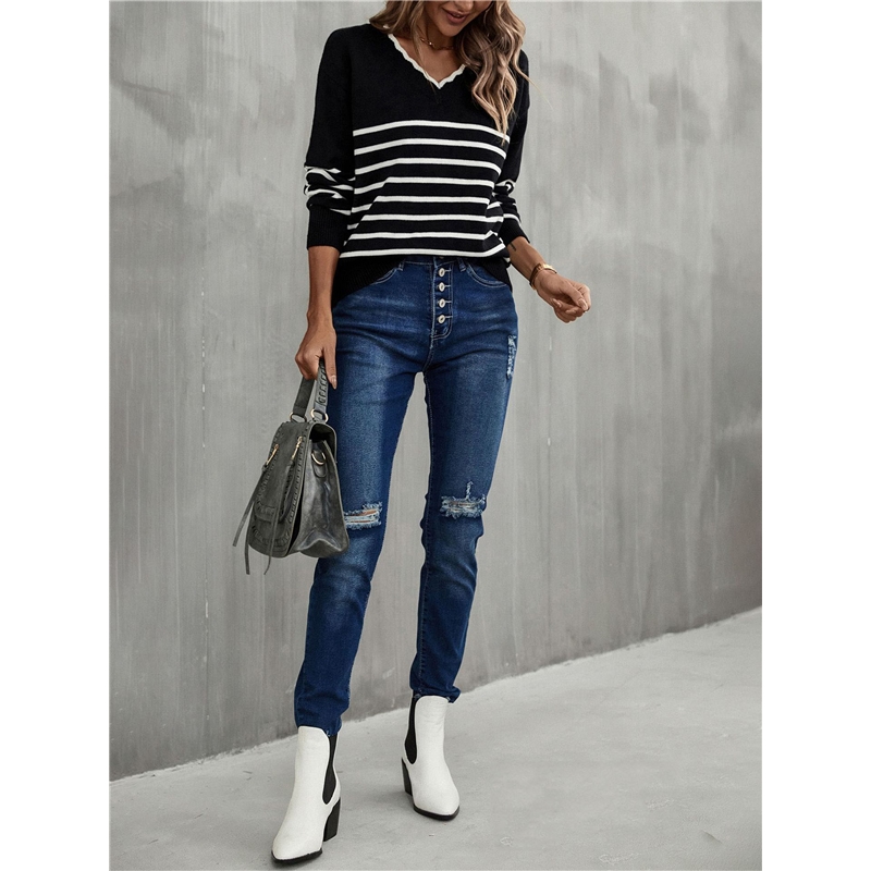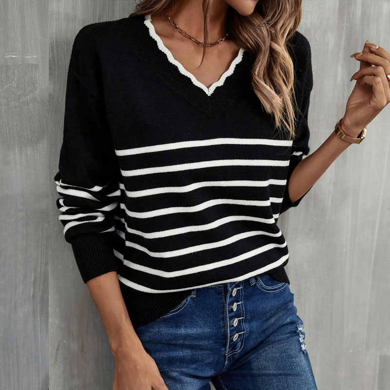 Constrast Color Striped V-Neck Casual Loose Sweater