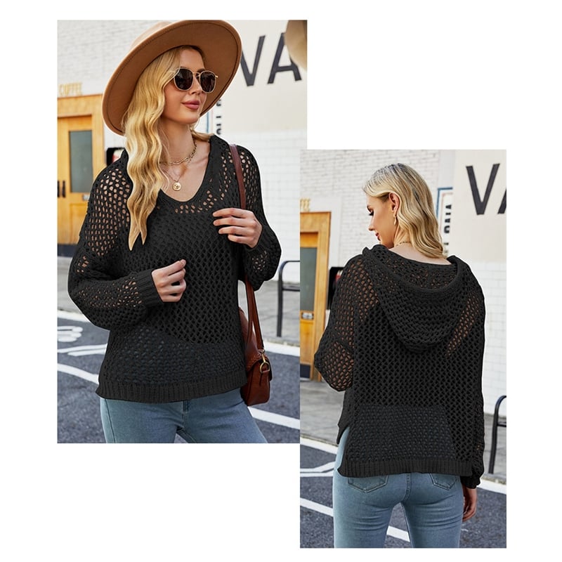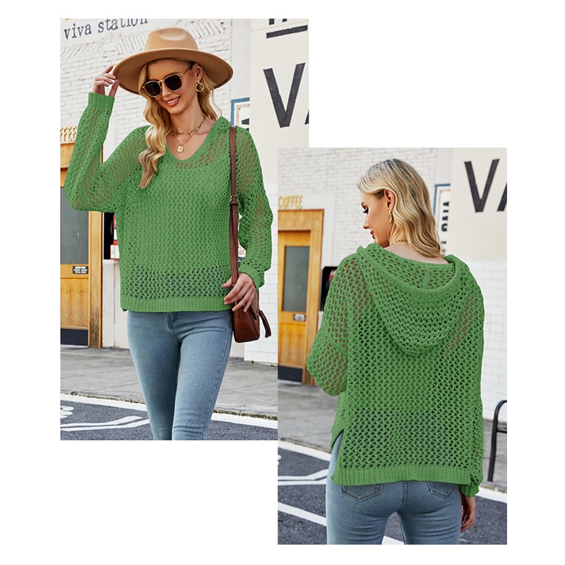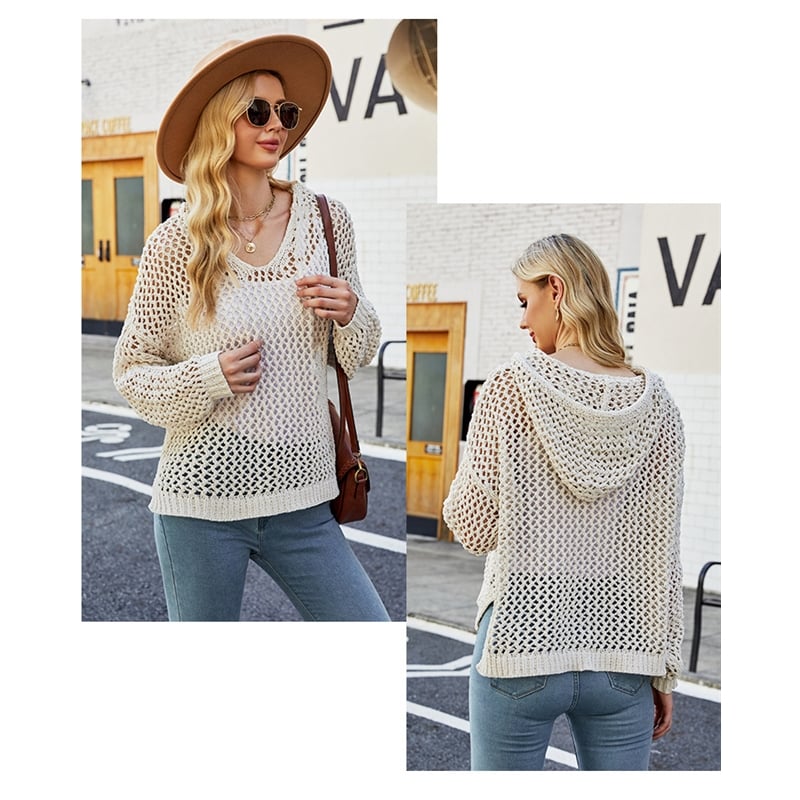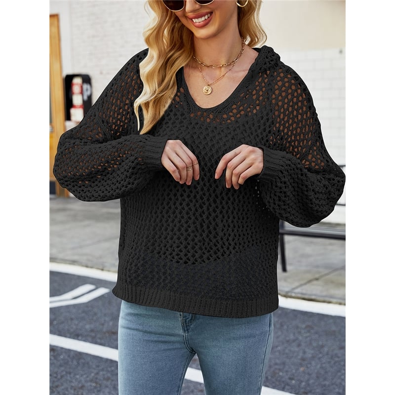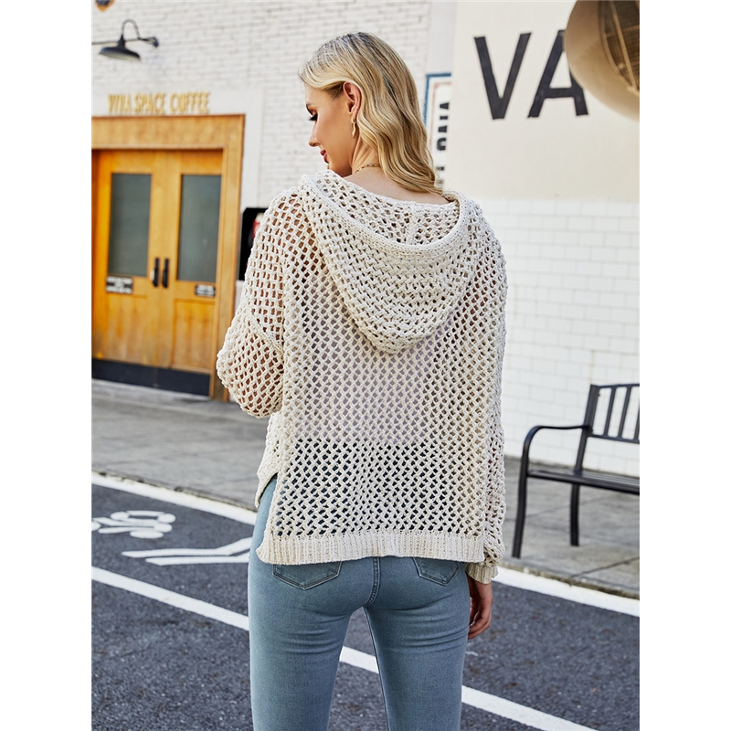 Solid Color Long Sleeves Hooded Hollow Loose Knitted Cover-Up