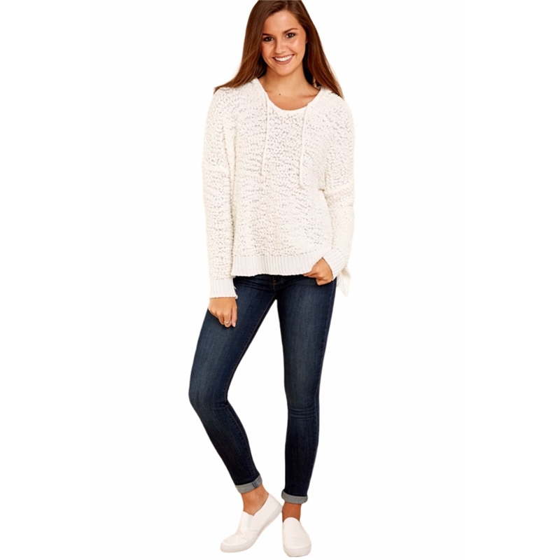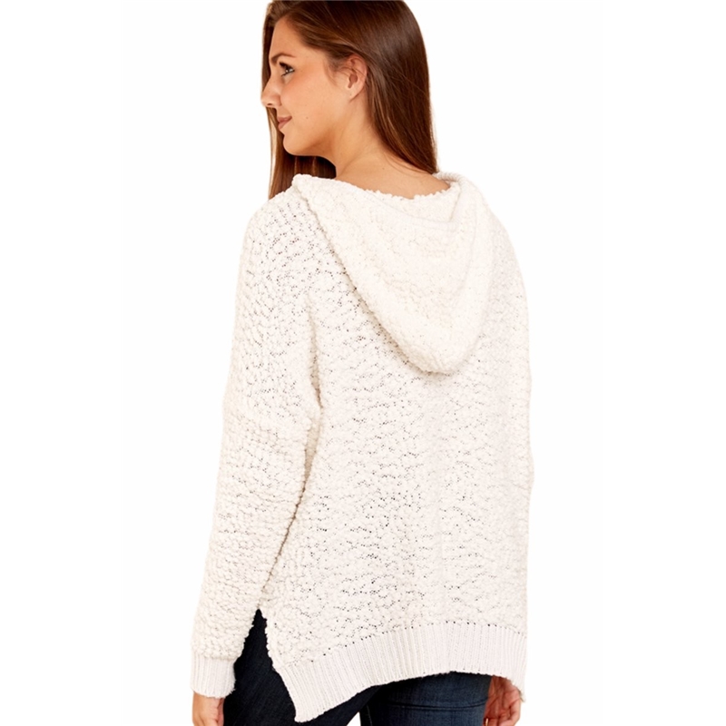 4. Design: The sweater has a simple solid color look with a hood and ribbed cuffs and hem.