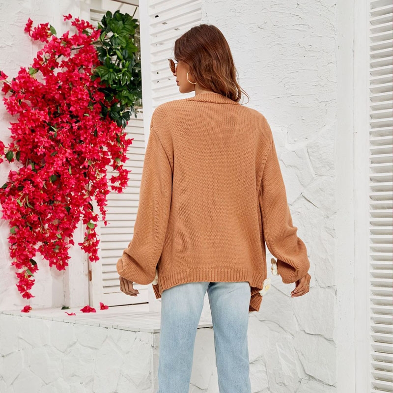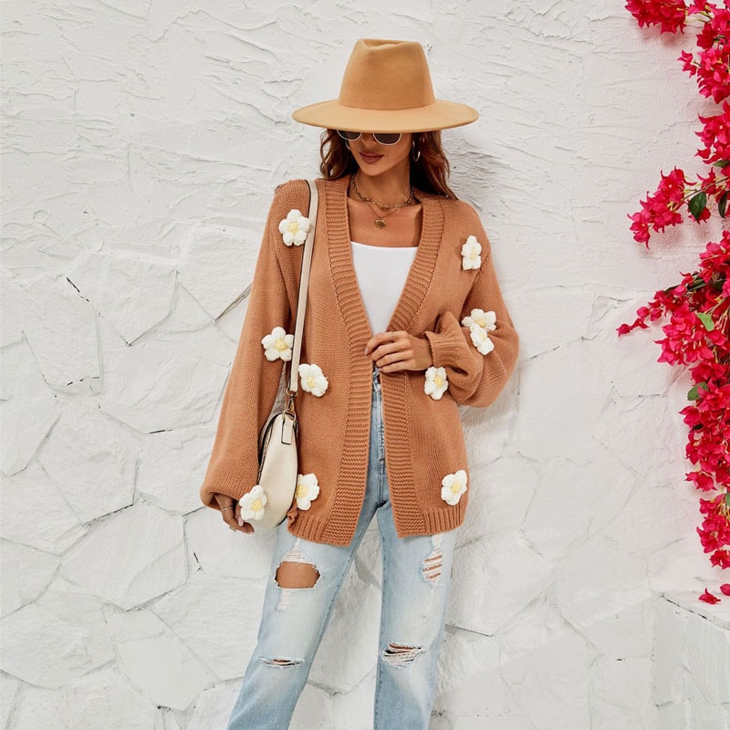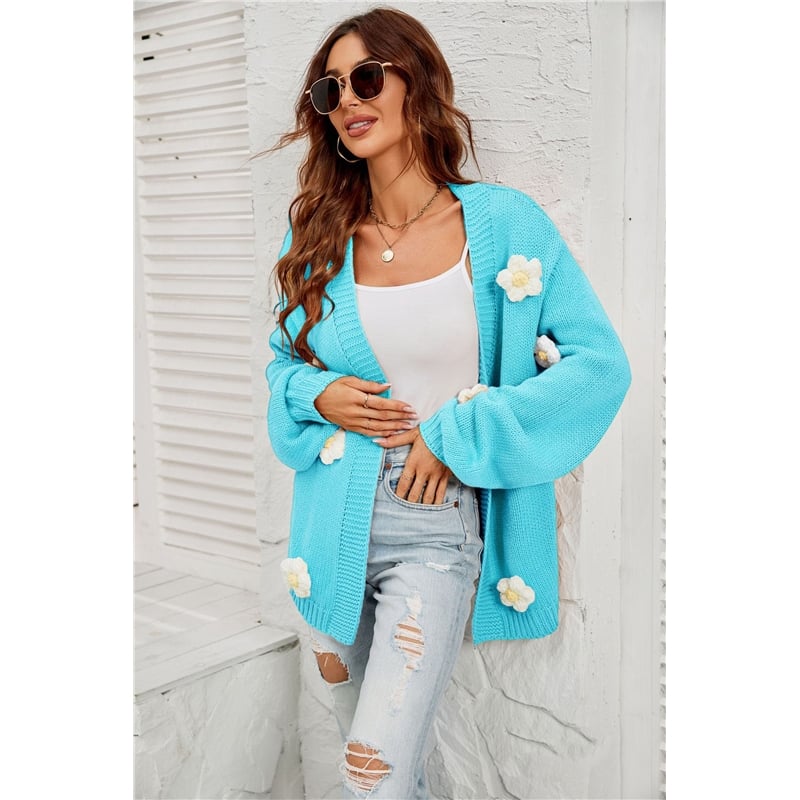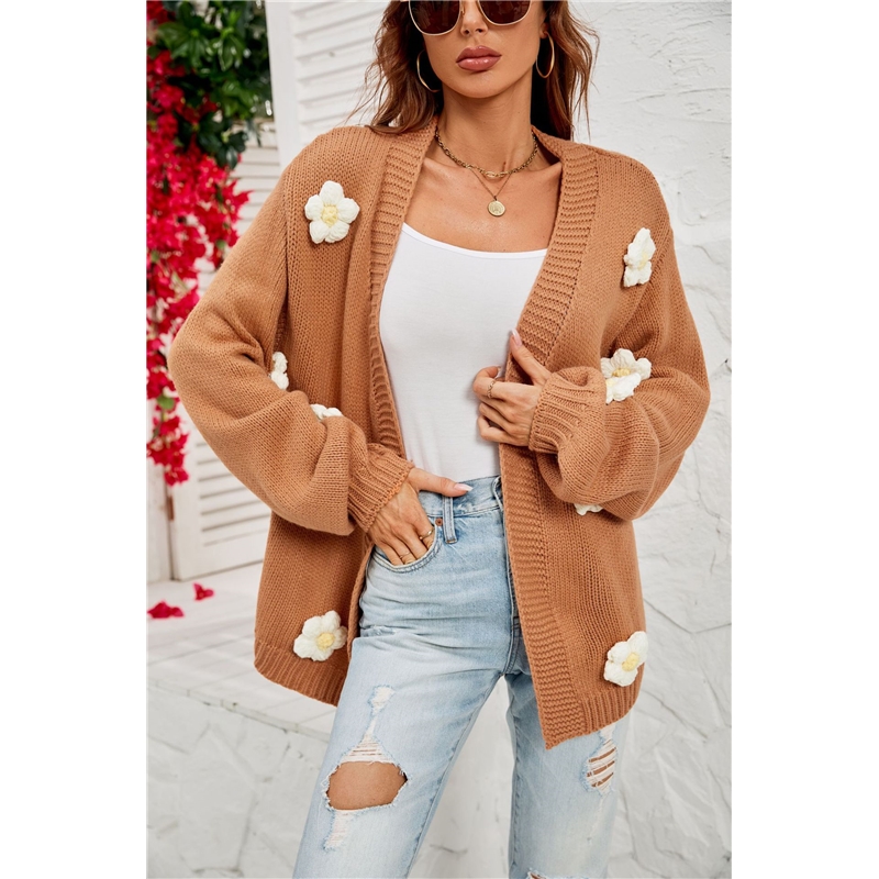 3. The cardigan is made of a soft knitted material and embellished with delicate flower detail.