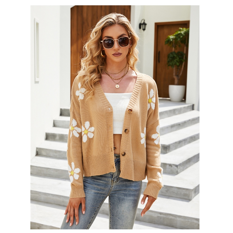 Long Sleeves V-Neck Flower Buttoned Knitted Cardigan Sweater