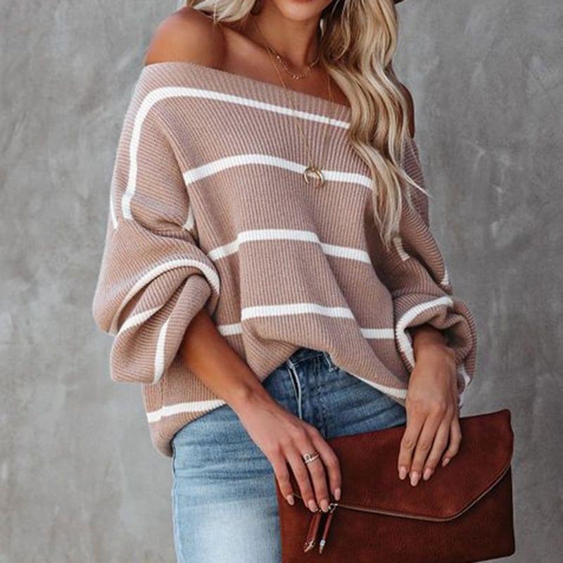 Sexy Striped Knit Sweaters With Leaky Shoulders And Lantern Sleeves