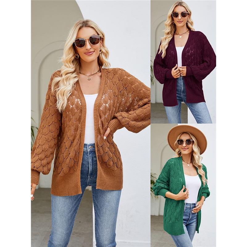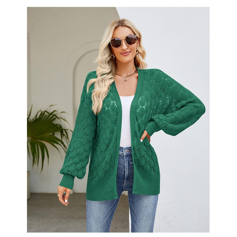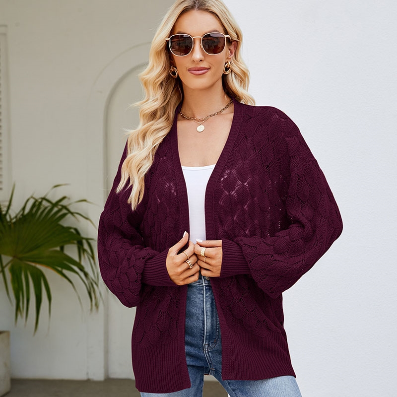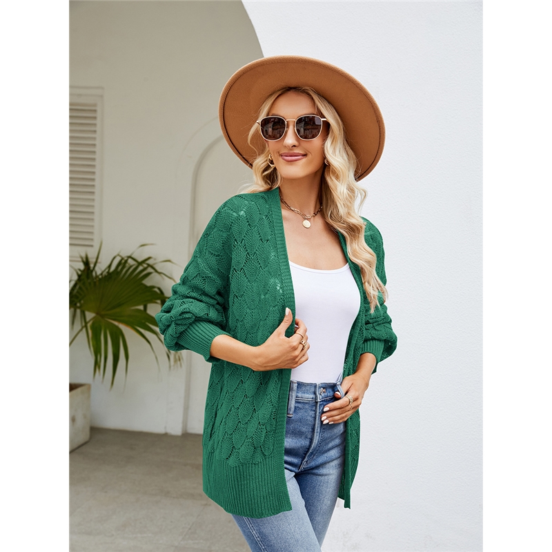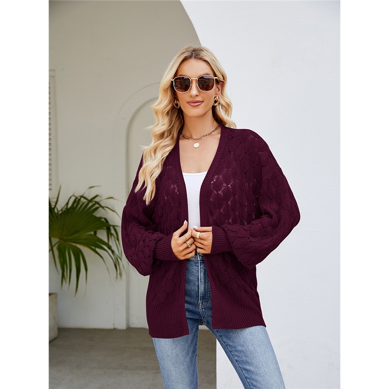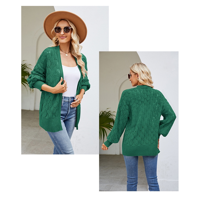 Long Sleeves Solid Color Hollow Knitted Cardigan