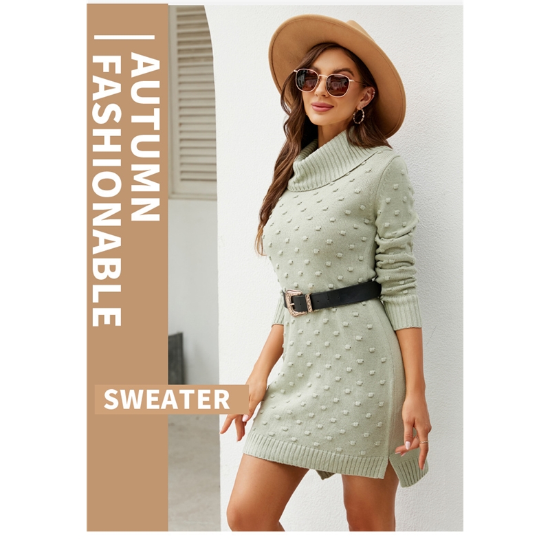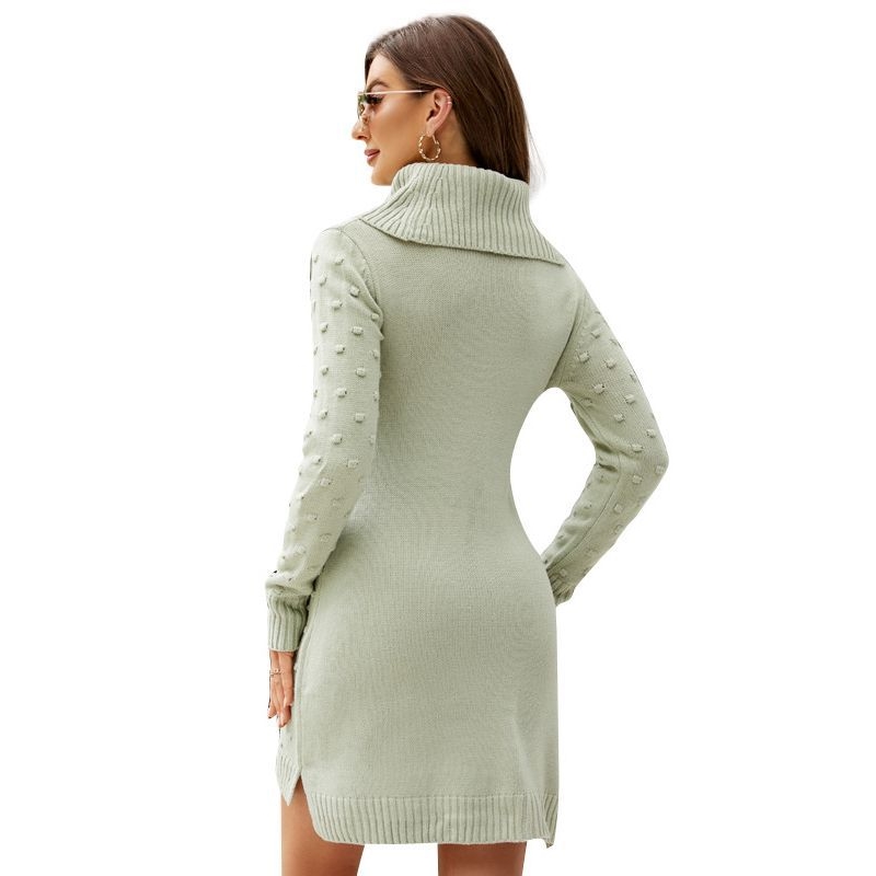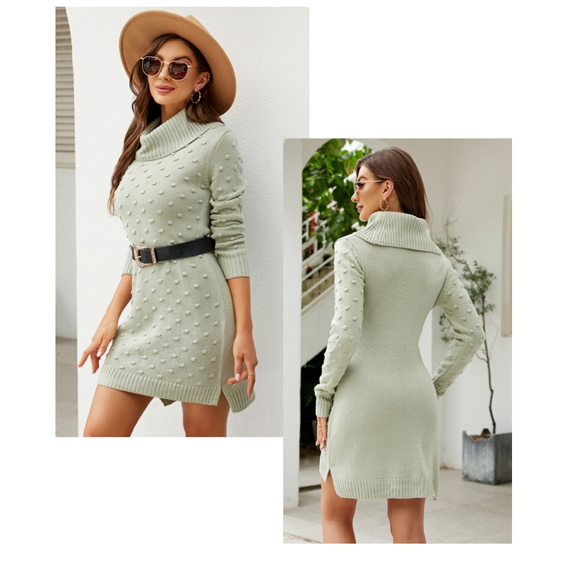 1. This knitted dress features a high neck with long sleeves for a modern, stylish look.