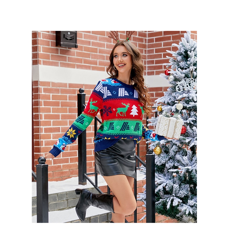 1. This Jacquard Contrast Color Christmas Pullover Knitted Sweater features a creative two-in-one design with a bright Christmas theme.