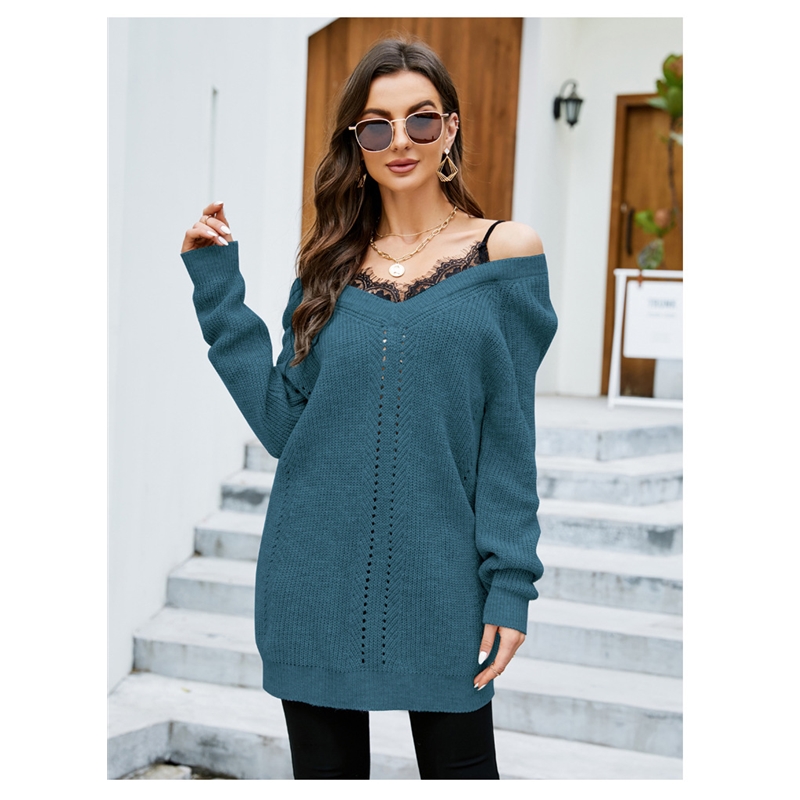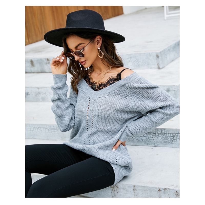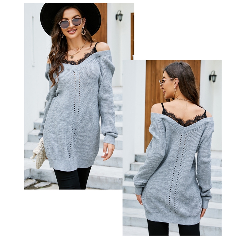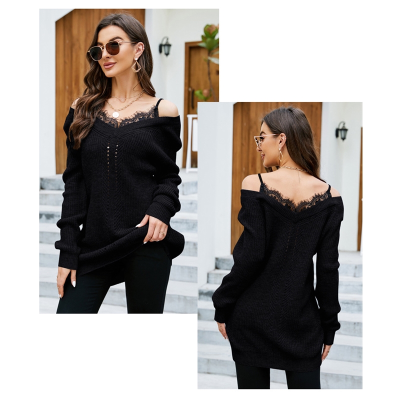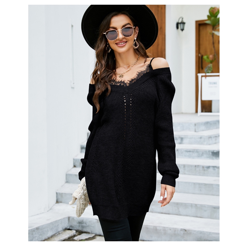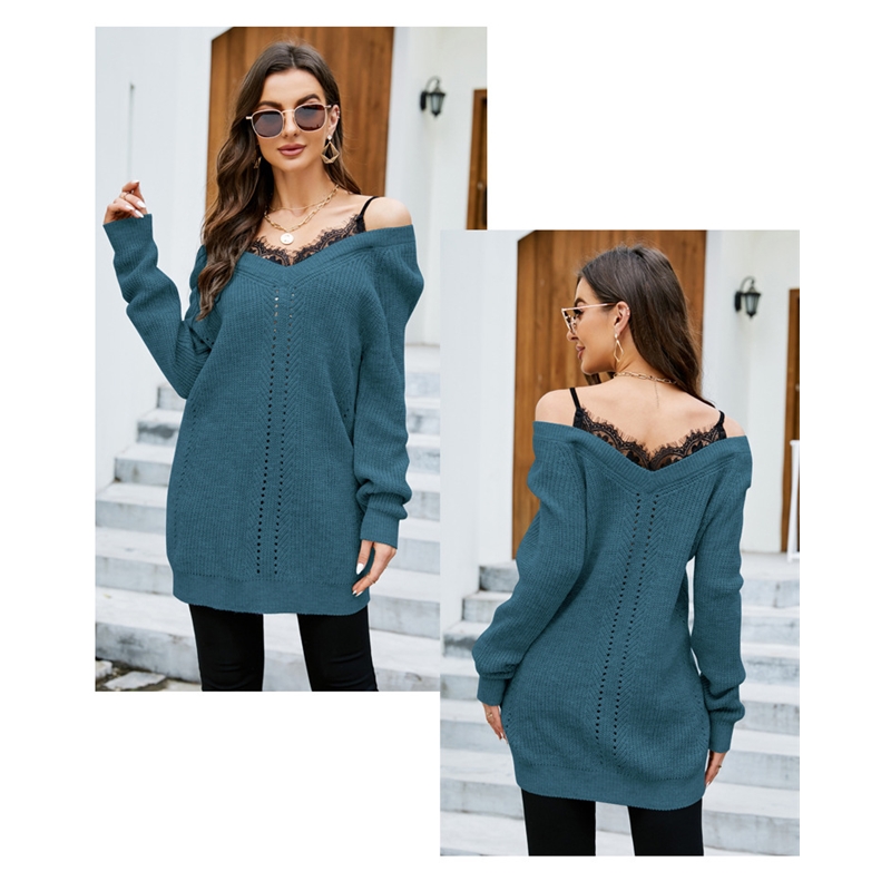 1. This knitted sweater features a unique lace patchwork design, creating a beautiful visual effect. The V-neck highlights the long sleeves and slightly flared hem of the piece.
