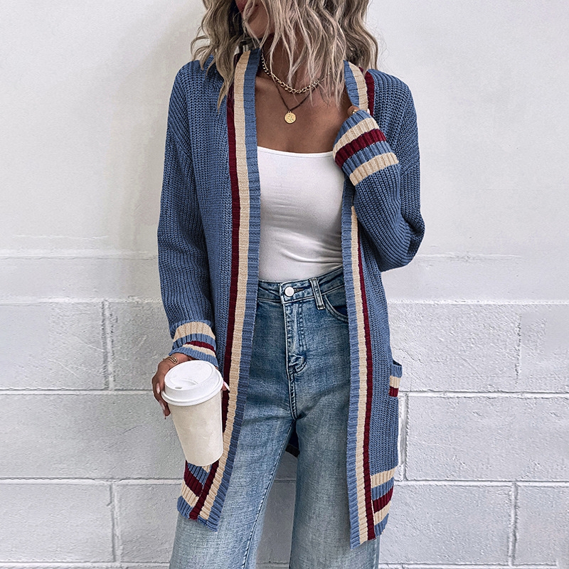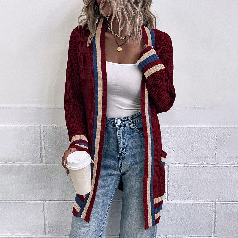 Striped Knit Pocket Cardigan Jacket Contrast Sweater