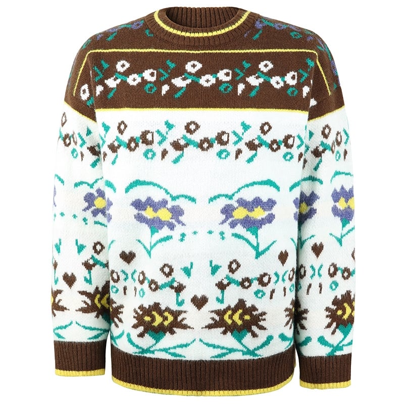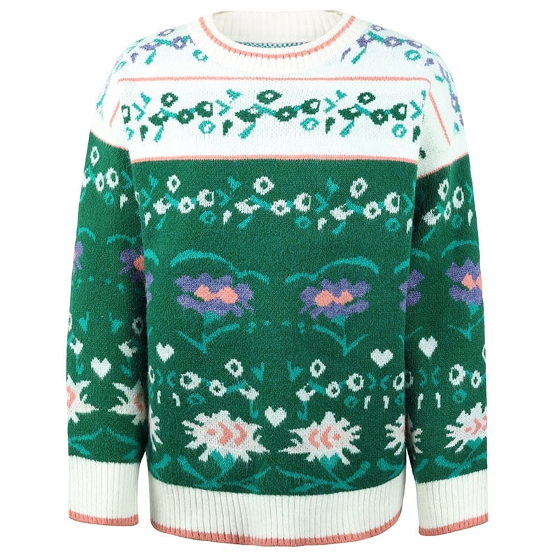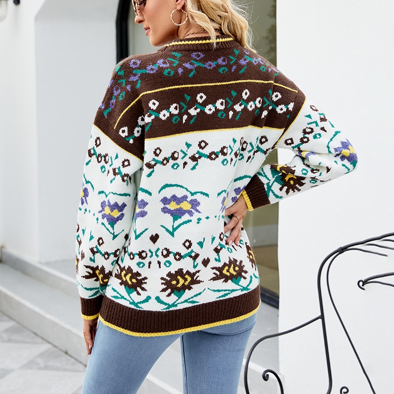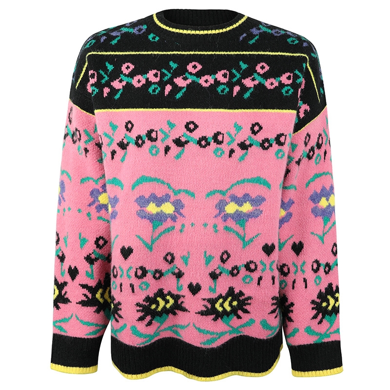 Round Neck Jacquard Knit Top With Flower Pullover Sweater