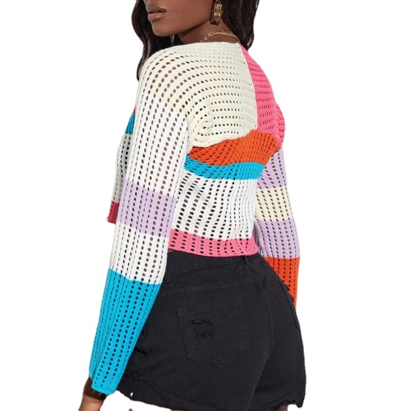 Contrast Color Long Sleeves Hollow Cropped Thin Knitted Sweater