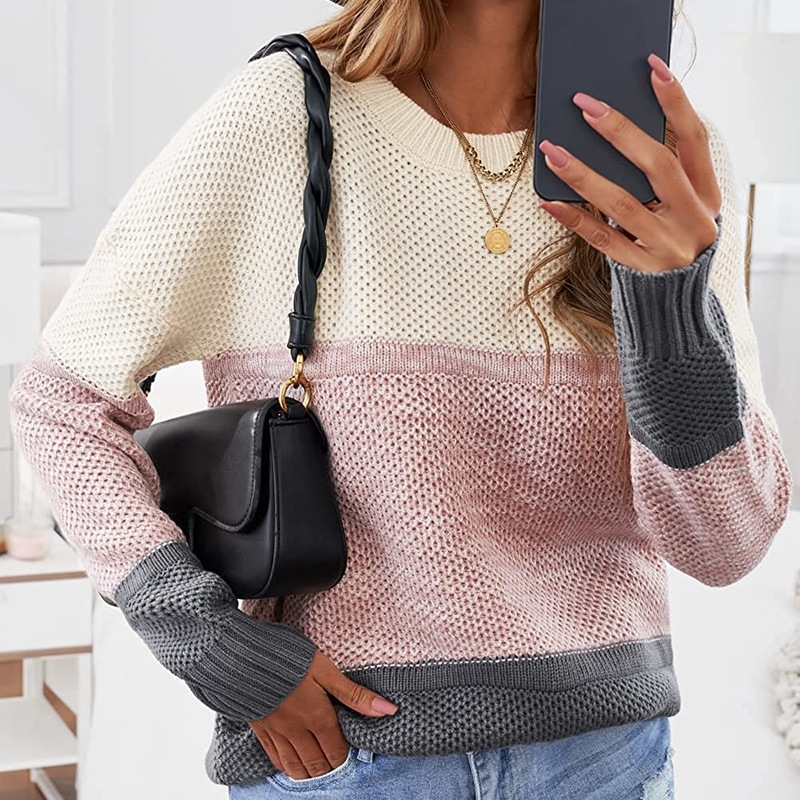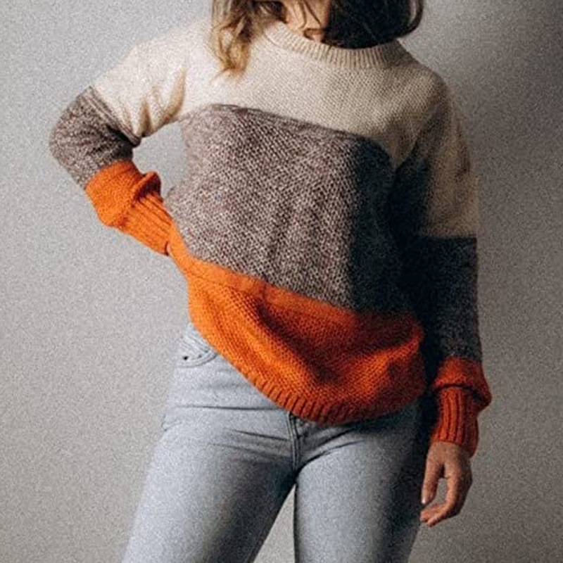 1. This Contrast Color Crewneck Long Sleeves Casual Knitted Sweater features a classic crewneck with long sleeves for a more traditional look.