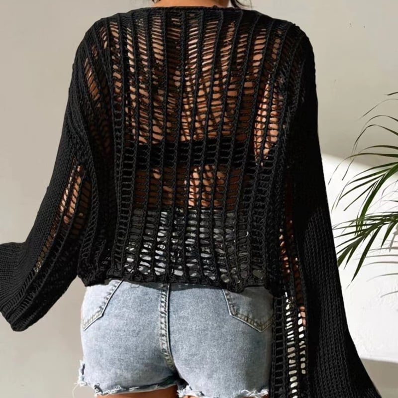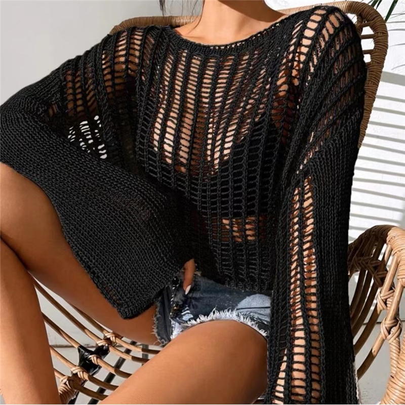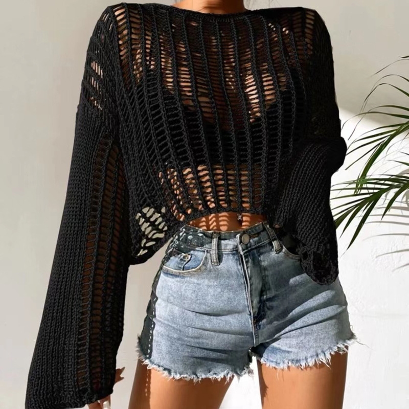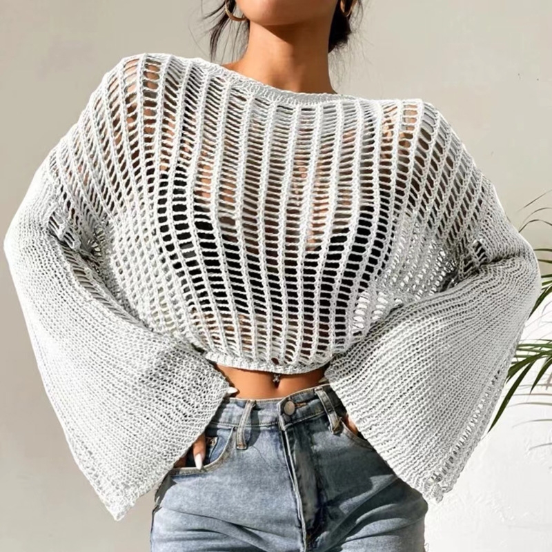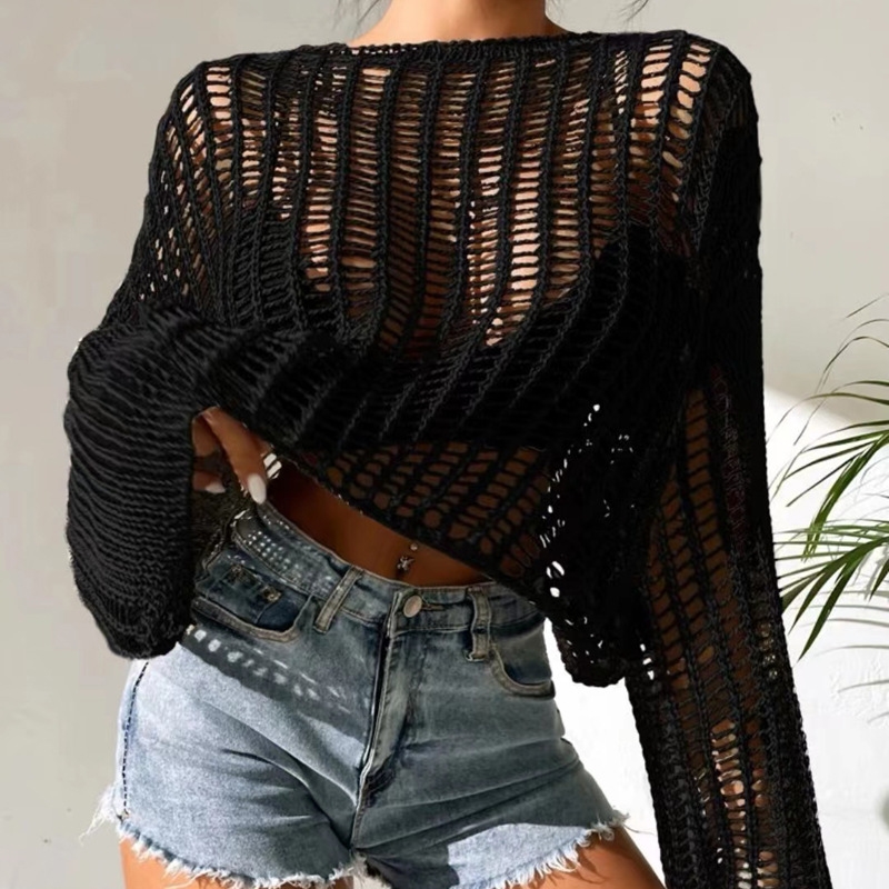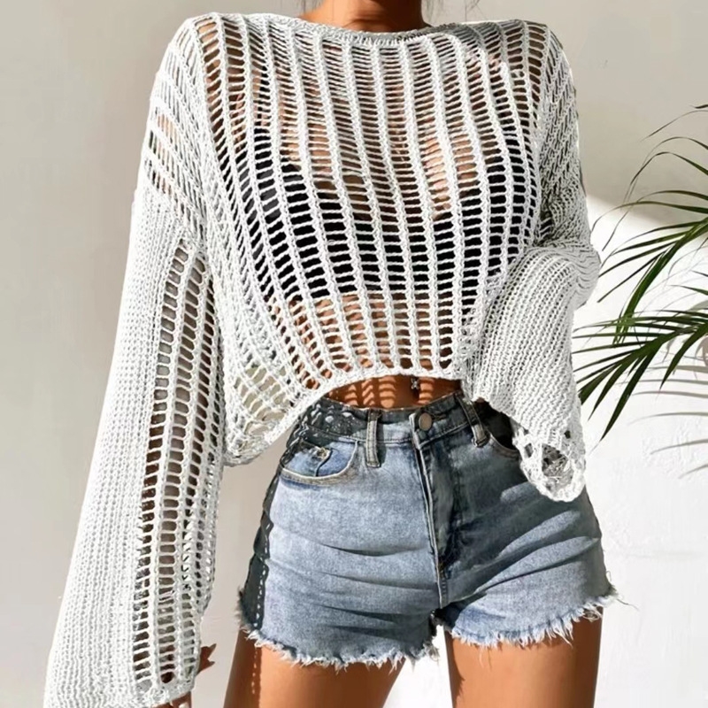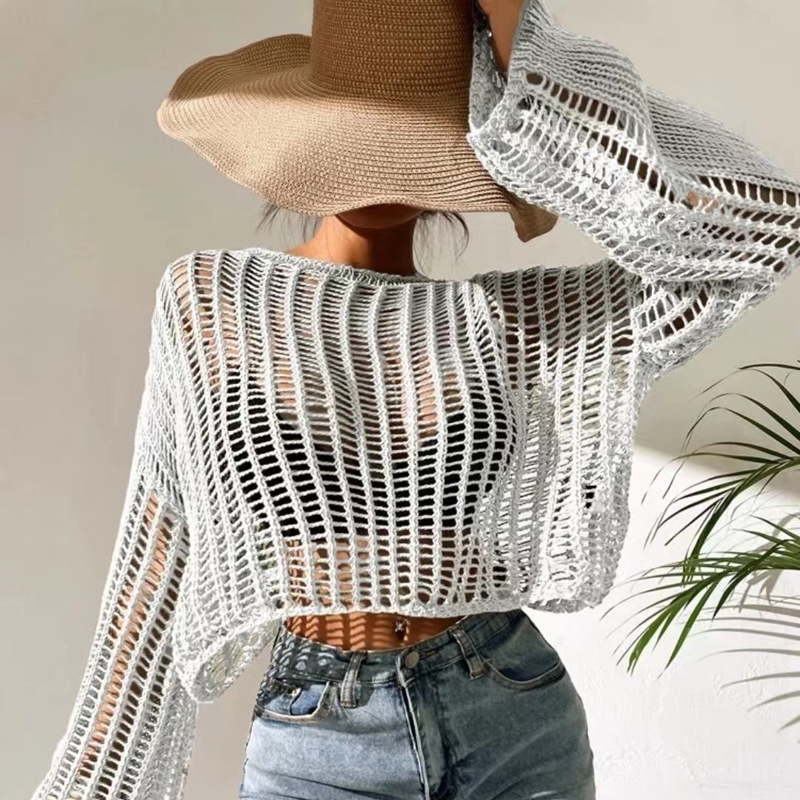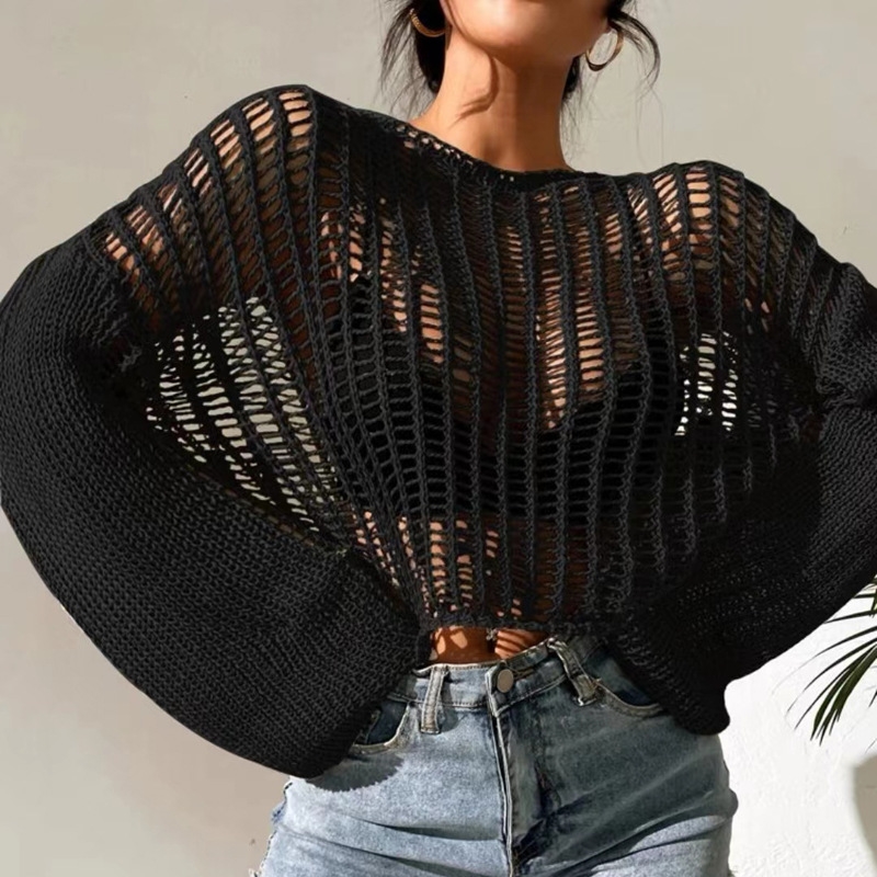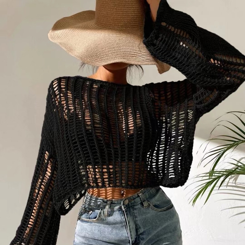 Solid Color Crewneck Long Sleeves Thin Hollow Knitted Cover-Up