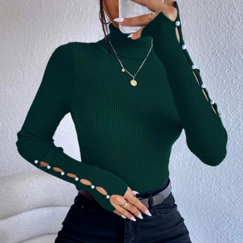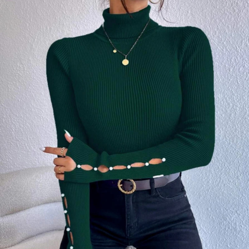 2. This elegant knitted sweater is crafted from a lightweight and breathable fabric knit to keep you comfortable and it also features a signature fold-over turtleneck and long sleeves.