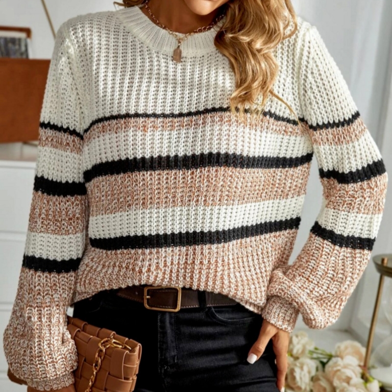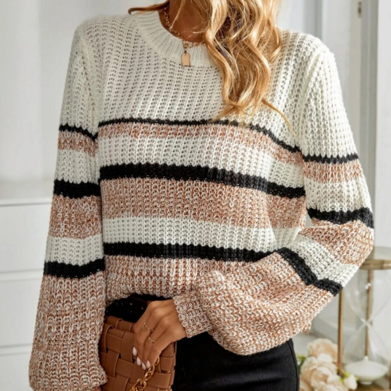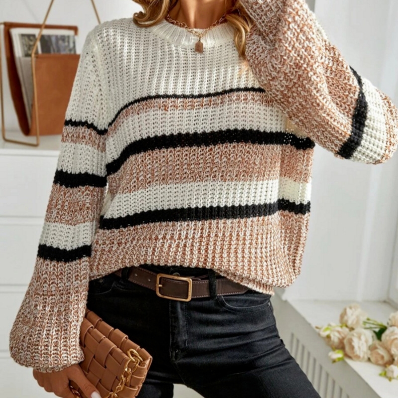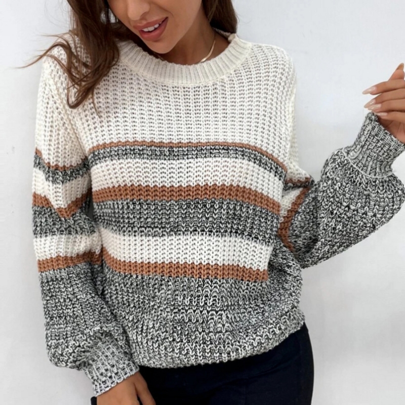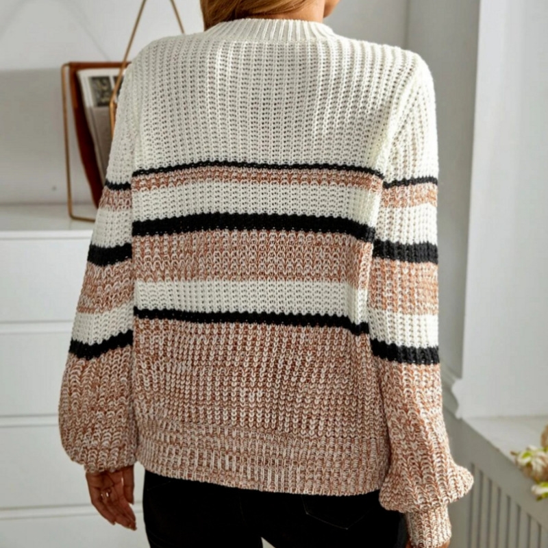 Contrast Color Crewneck Long Sleeves Striped Knitted Sweater