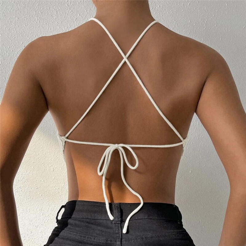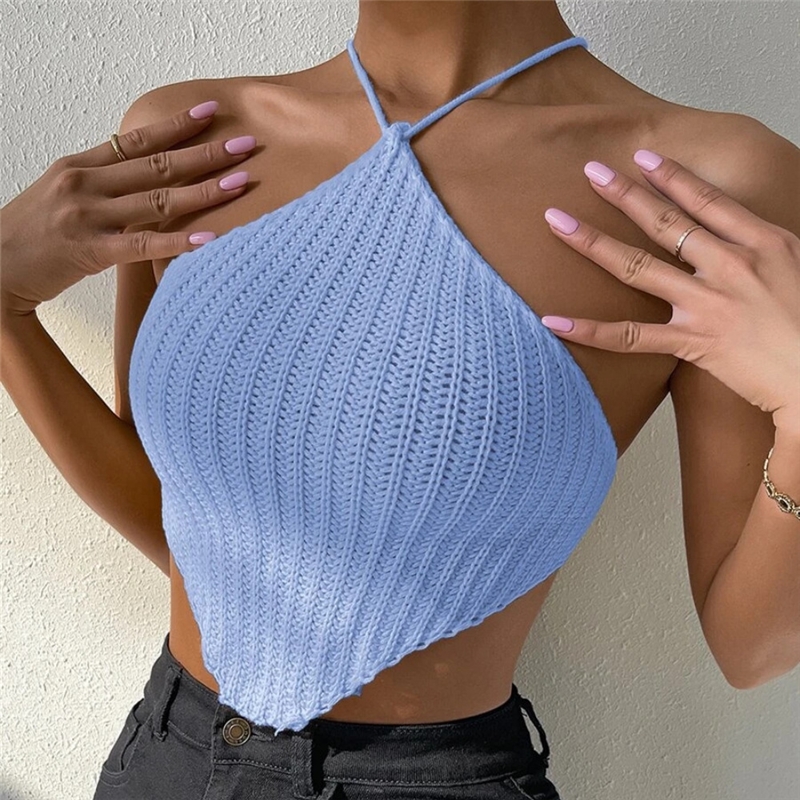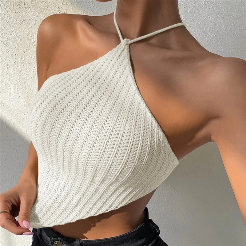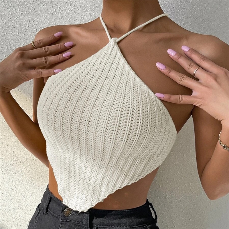 Solid Color Halterneck Backless Tied Slim Knitted Tank Top