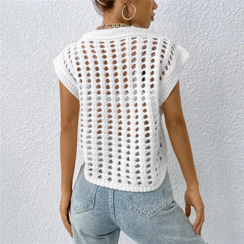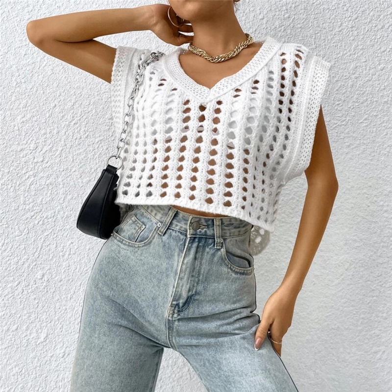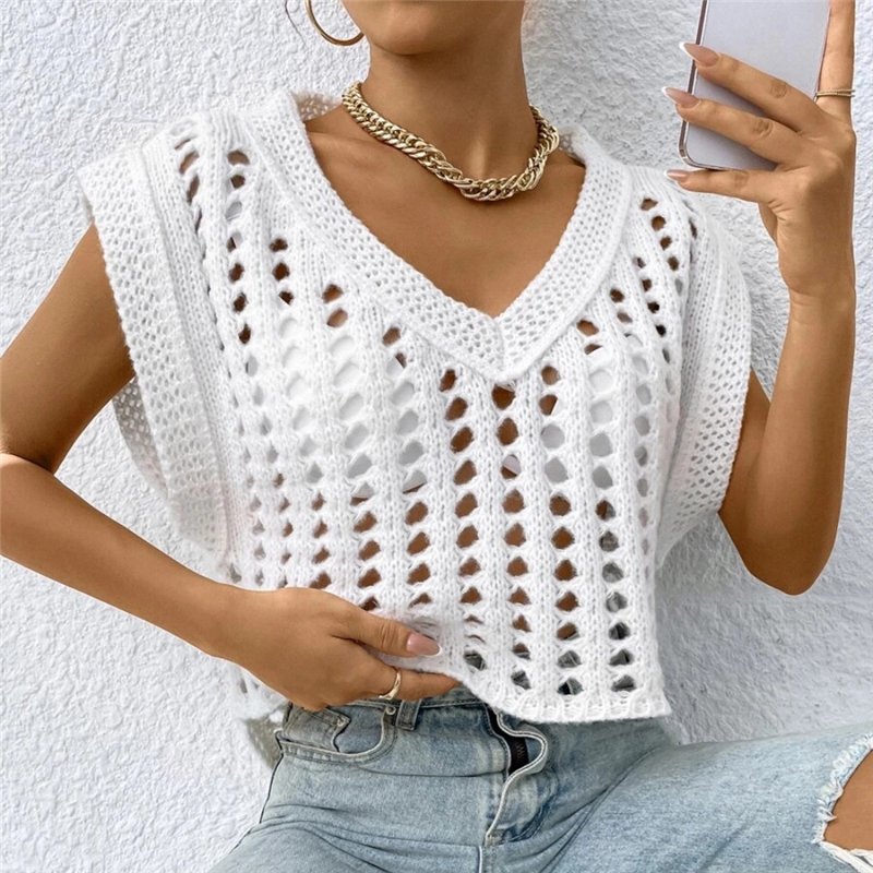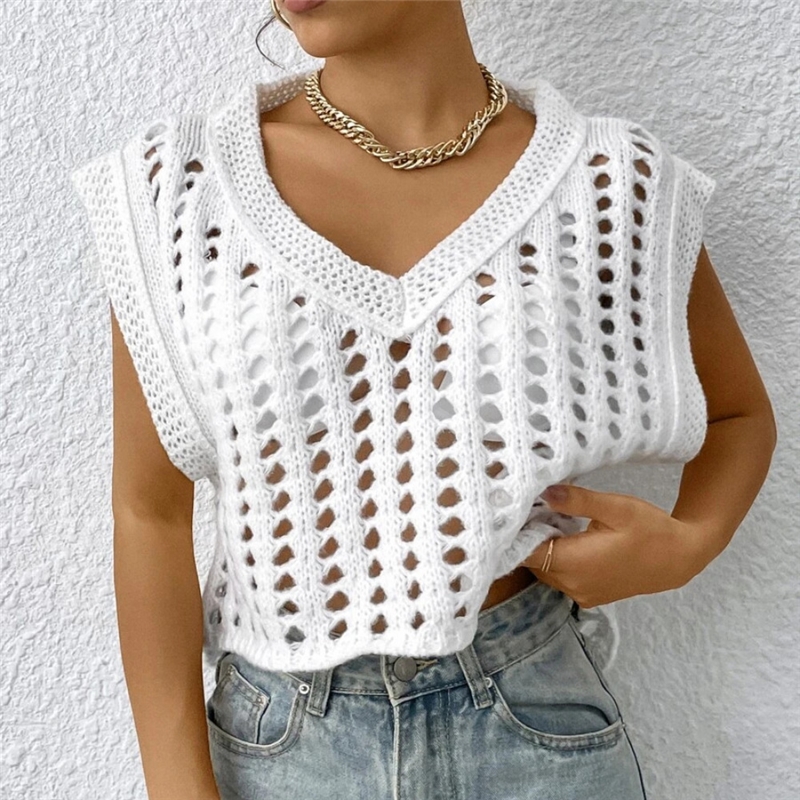 Solid Color V-Neck Sleeveless Hollow Knitted Tank Top