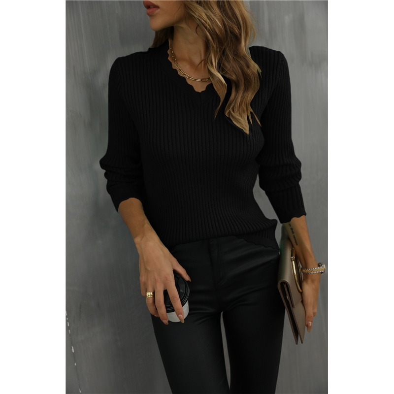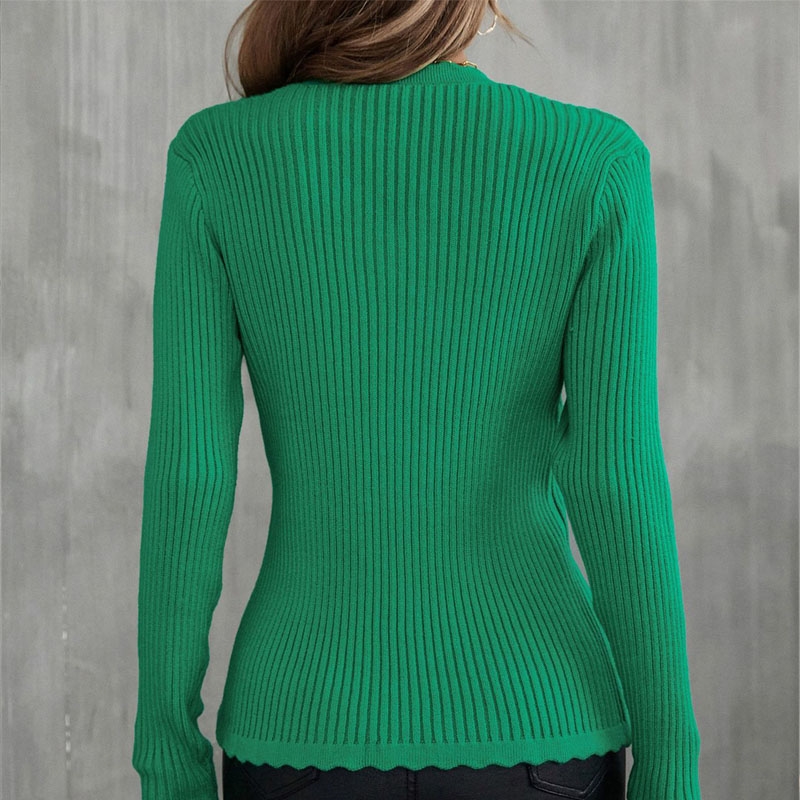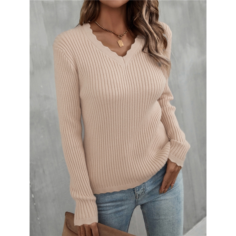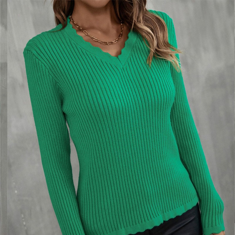 Solid Color V-Neck Long Sleeves Ribbed Slim Sweater