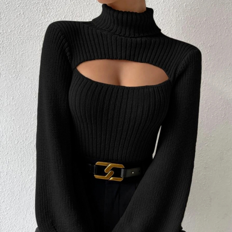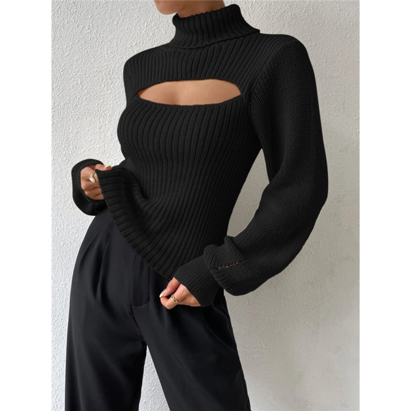 Solid Color Long Sleeves High Neck Hollow Slim Knitted Sweater