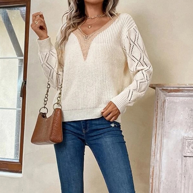 Long Sleeves V-Neck Hollow Casual Loose Pullover Sweater