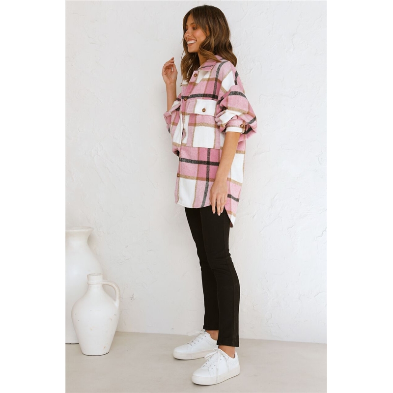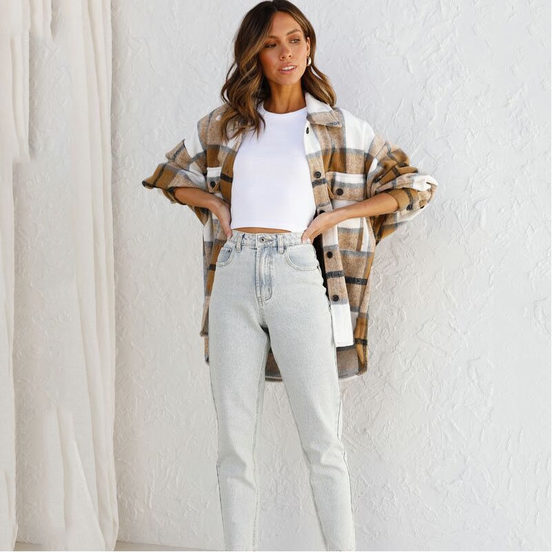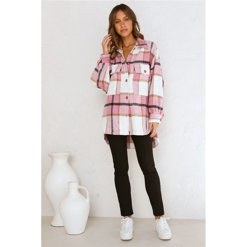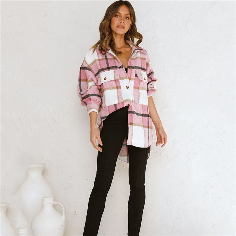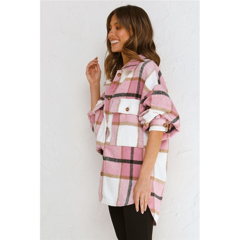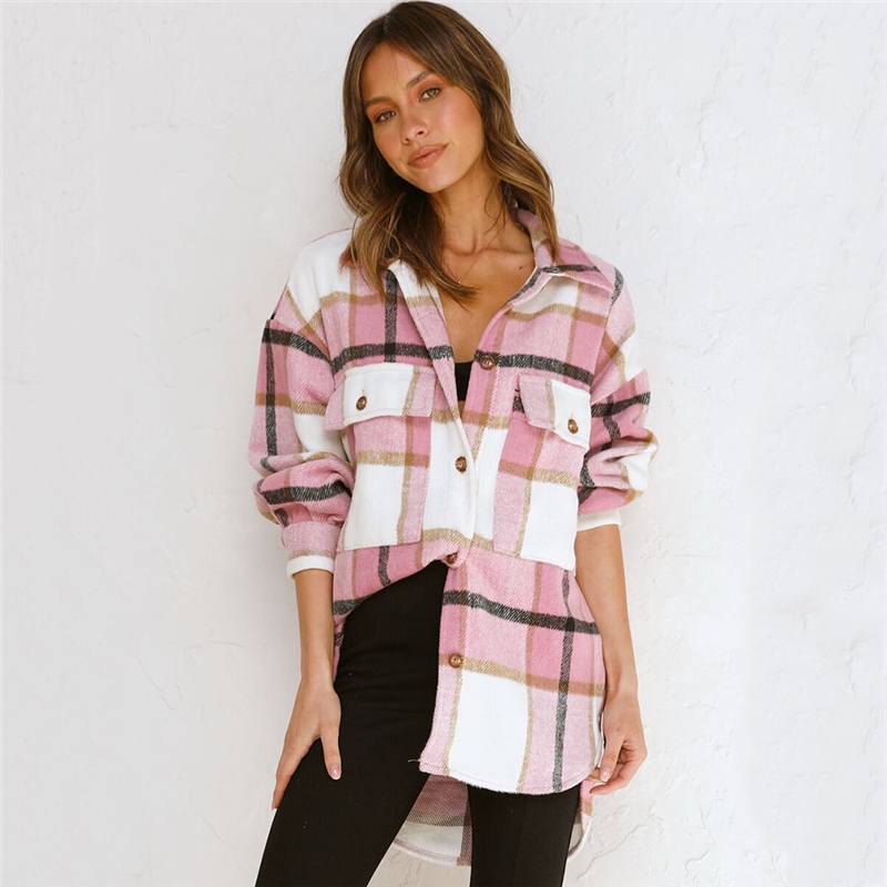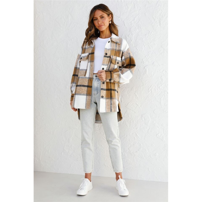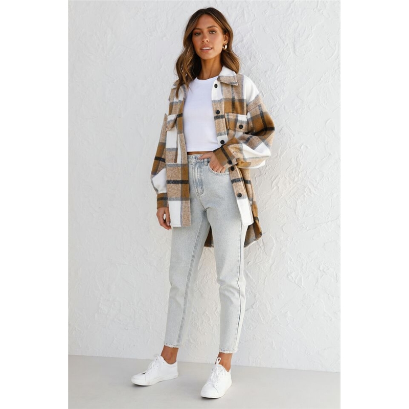 1.This mid-length woolen jacket features a classic retro-inspired plaid pattern with a mix of autumn-appropriate jewel tones.