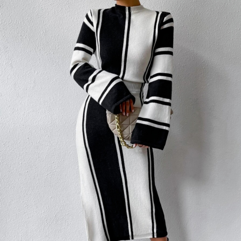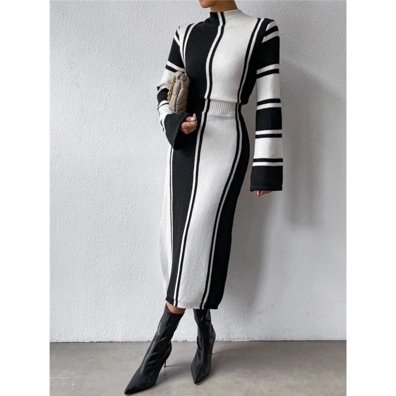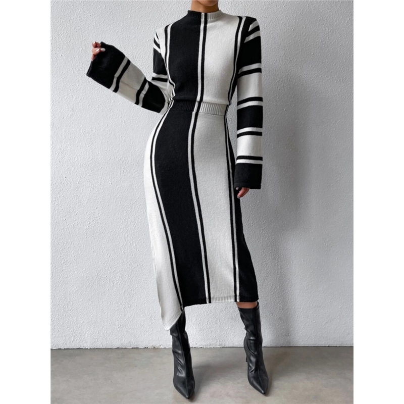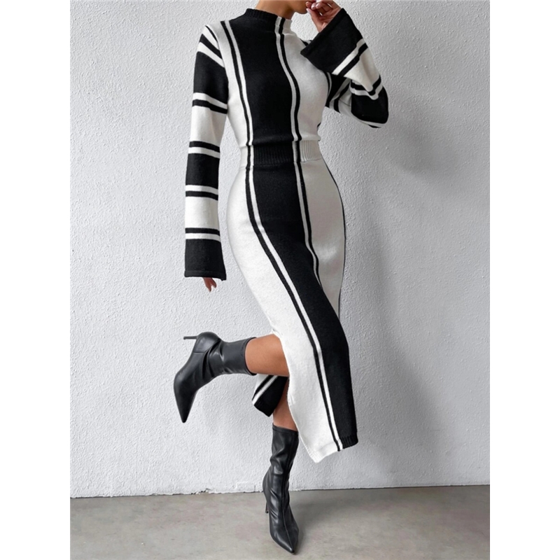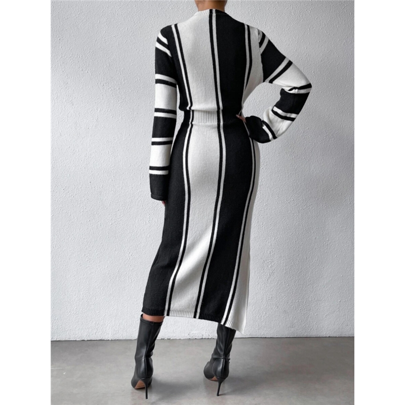 This Contrast Color Long Sleeves Knitted Dress is a modern addition to your wardrobe. The dress features a comfortable, slim fit which flatters the body, and long sleeves for warmth. The dress comes in a contrast of two colors - black and white which creates an eye-catching design. The material is a soft and comfortable knitted fabric which is breathable and light. It also features a round neckline and an eye-catching pattern knitting around the waist. The dress can be dressed up or down to suit any look and is perfect for stylish day-to-day wear.