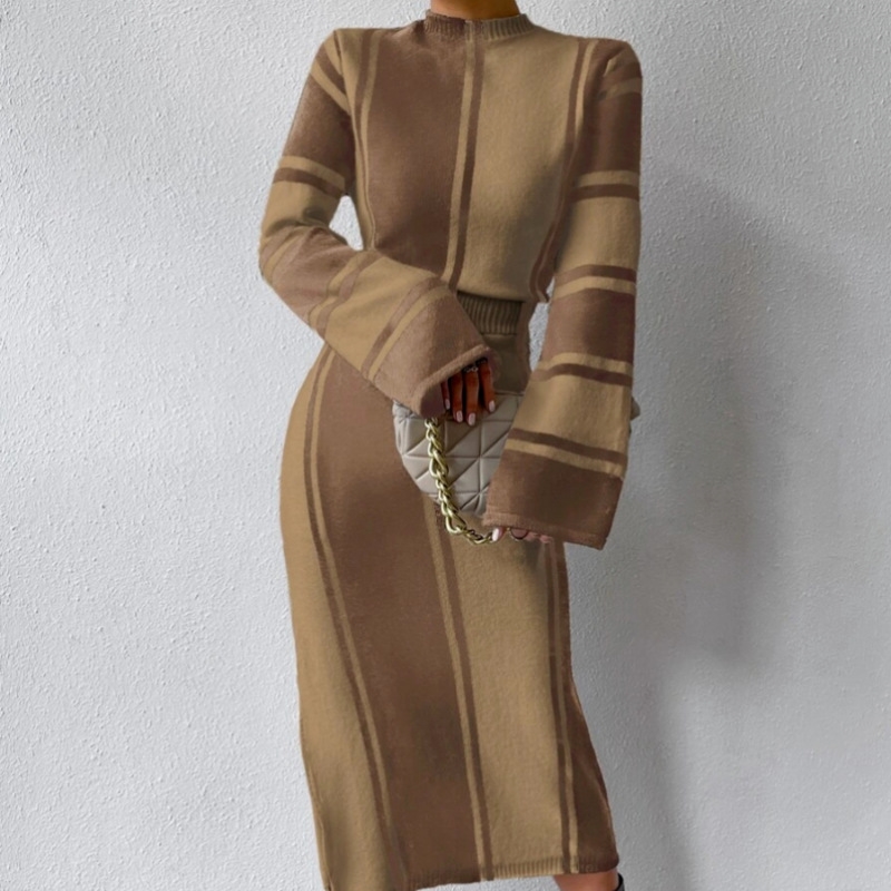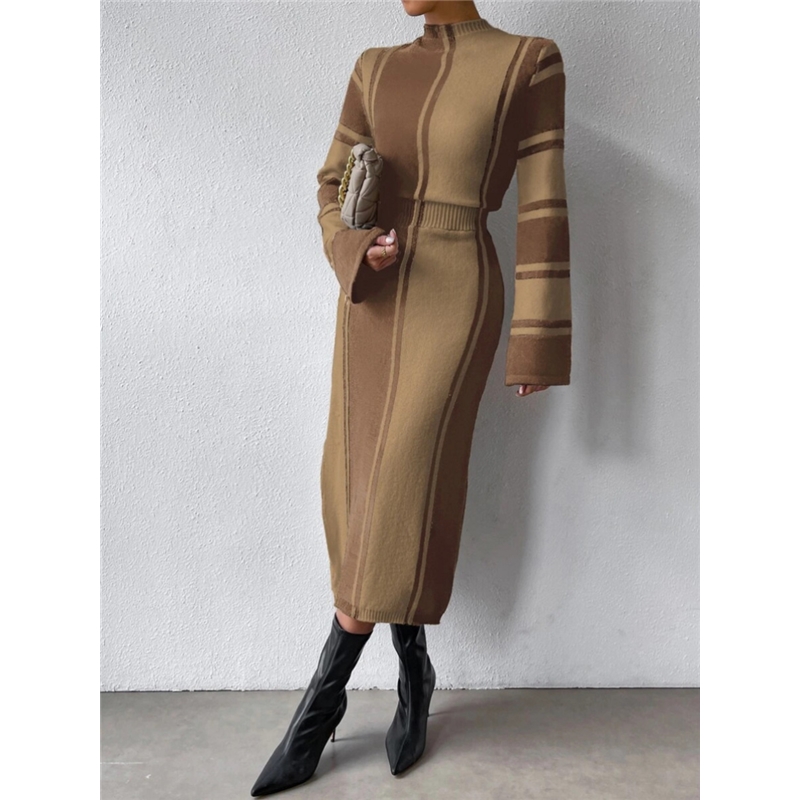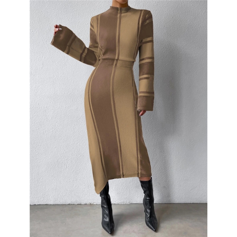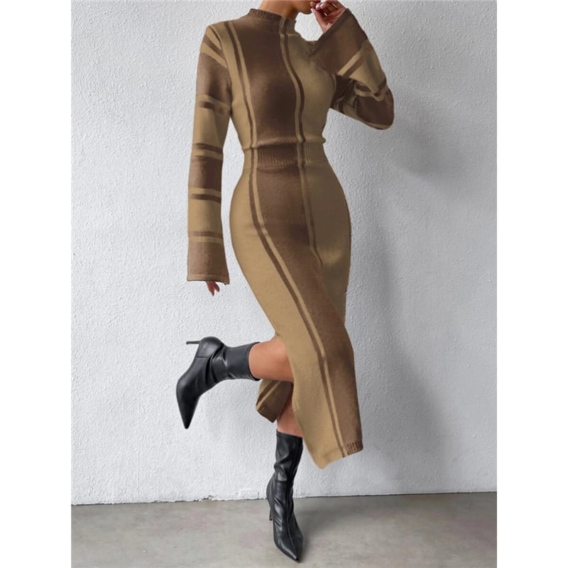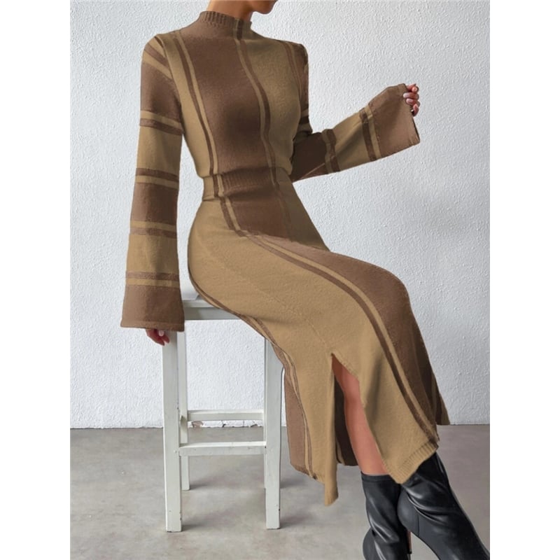 This Contrast Color Long Sleeves Knitted Dress is a modern addition to your wardrobe. The dress features a comfortable, slim fit which flatters the body, and long sleeves for warmth. The dress comes in a contrast of two colors - black and white which creates an eye-catching design. The material is a soft and comfortable knitted fabric which is breathable and light. It also features a round neckline and an eye-catching pattern knitting around the waist. The dress can be dressed up or down to suit any look and is perfect for stylish day-to-day wear.