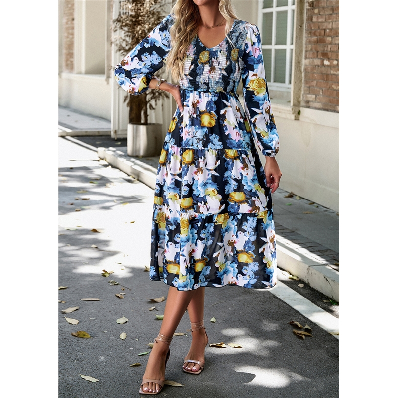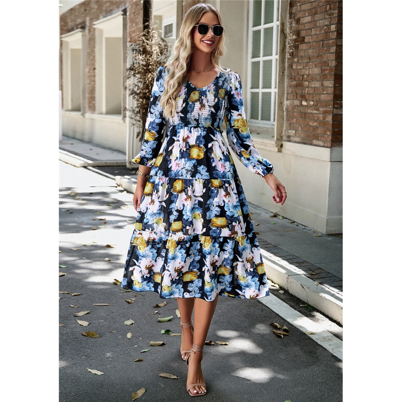 4. The print pattern on the dress provides a splash of color and visual interest.