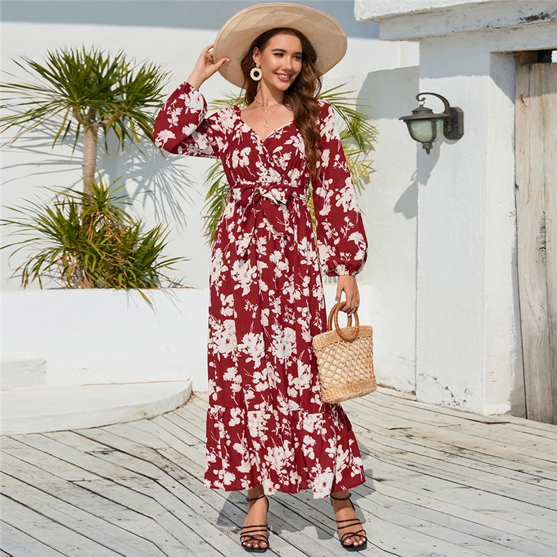1. This dress features a playful silhouette with floral lantern sleeves and a tie waist.