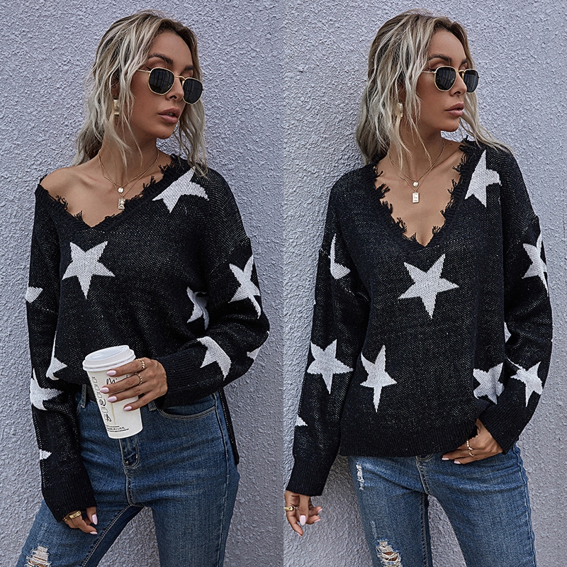 Long Sleeves V-Neck Printed Casual Loose Pullover Knitted Sweater